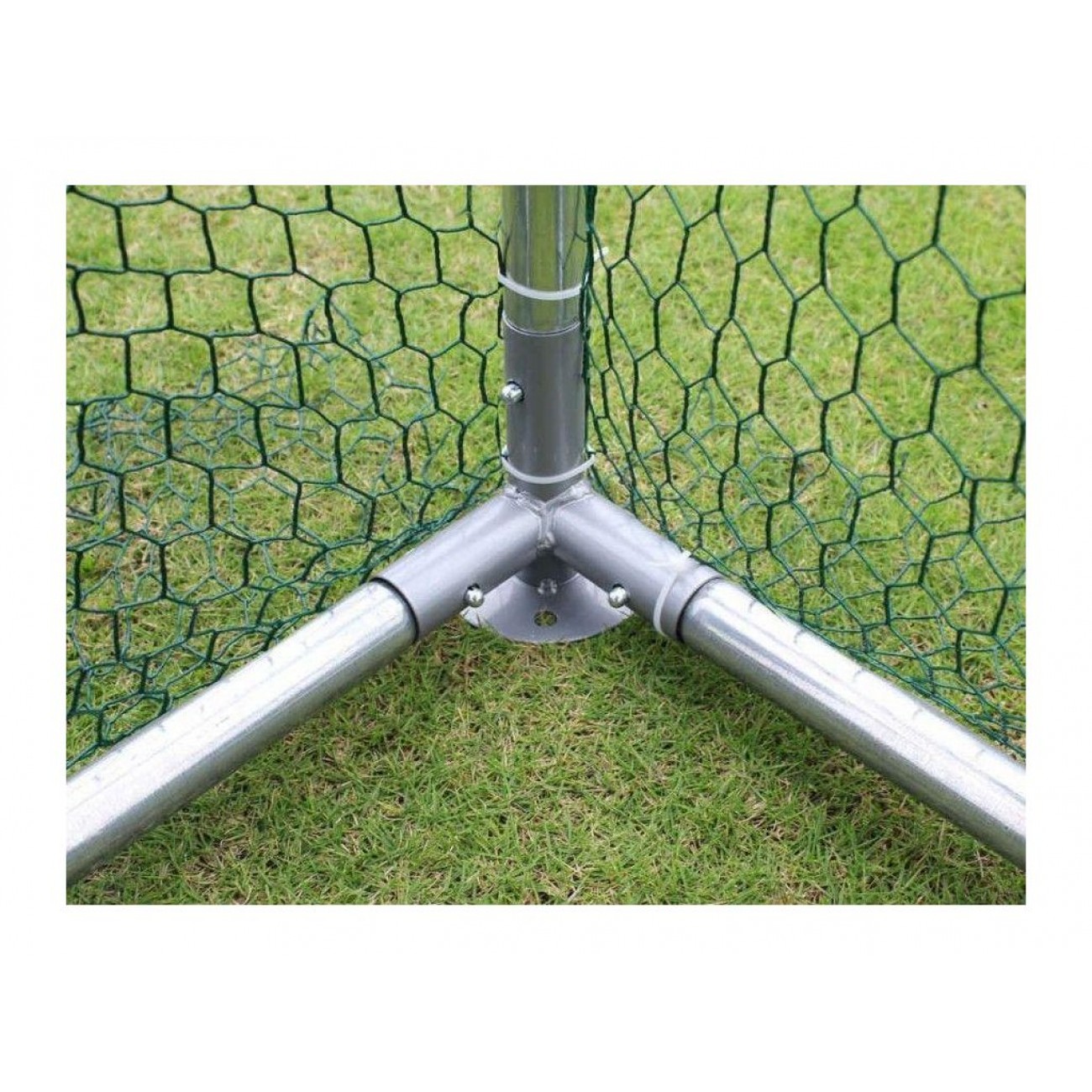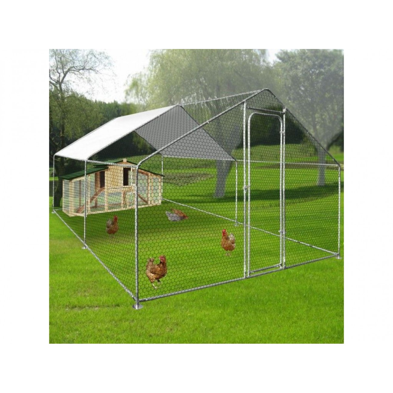 Рама виконана з оцинкованої сталевої труби діаметром 25x0,65 мм, дуже міцна, стійка і не схильна до корозії. Сітка з оцинкованої сталі стійка до розривів і має вічка розміром 45х25 мм, що унеможливлює втечу птиці та проникнення у вольєр хижаків. Частина накриття вольєра сітчаста, а інша частина - з водонепроникного, УФ-стійкого ПВХ матеріалу для захисту птахів від опадів і палючого сонця. Для зручності догляду є вмонтовані двері з засувом. Цей вольєр для птахів поставляється з усіма кріпильними елементами, тому його встановлення не складатиме труднощів.
