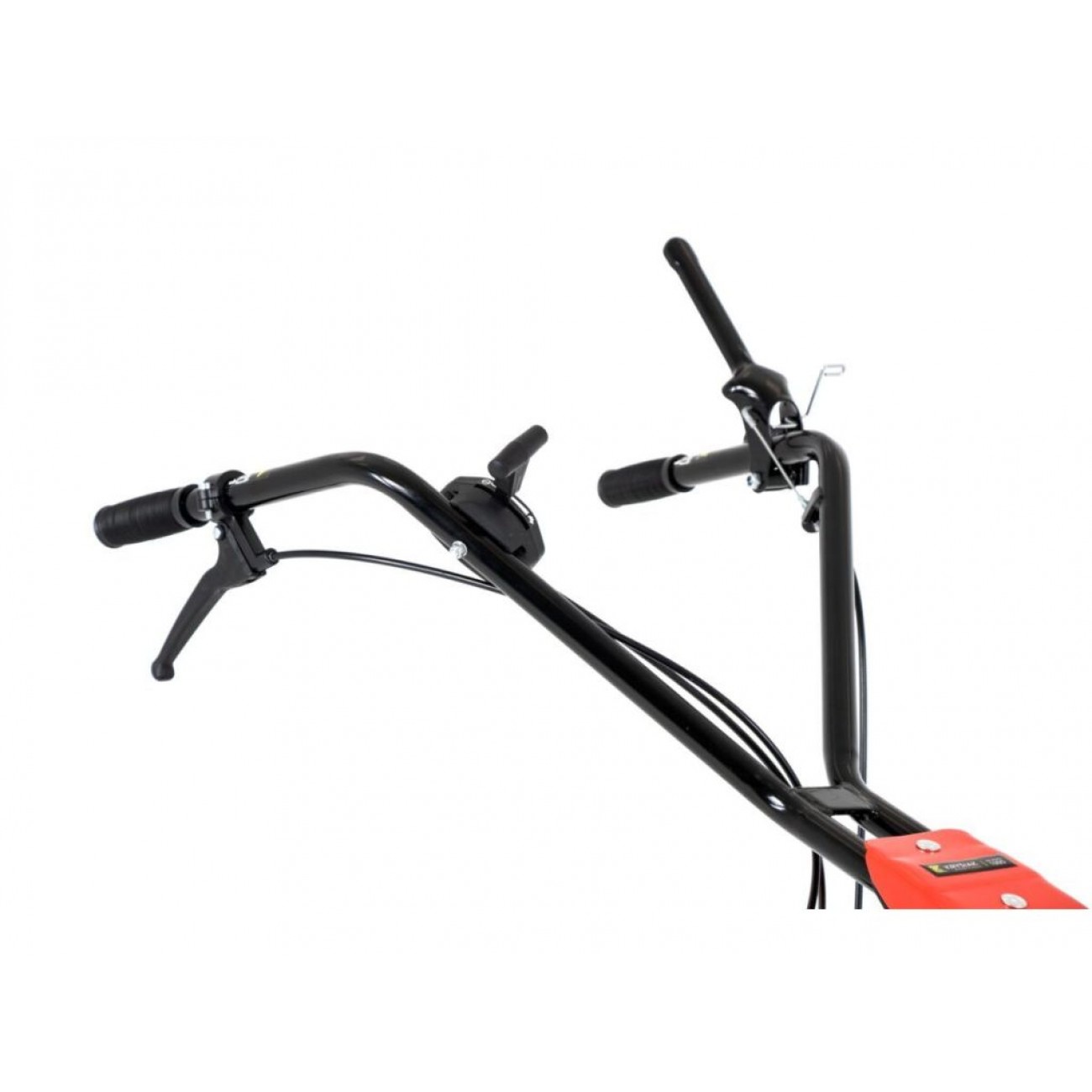 Бензинова косарка Faworyt JK87-196L скошує траву за допомогою спеціальних рухомих ножів на косильному брусі. Крім того, ця модель має 1 передню передачу, 2 великих колеса, привід, ручку газу та важіль старту.