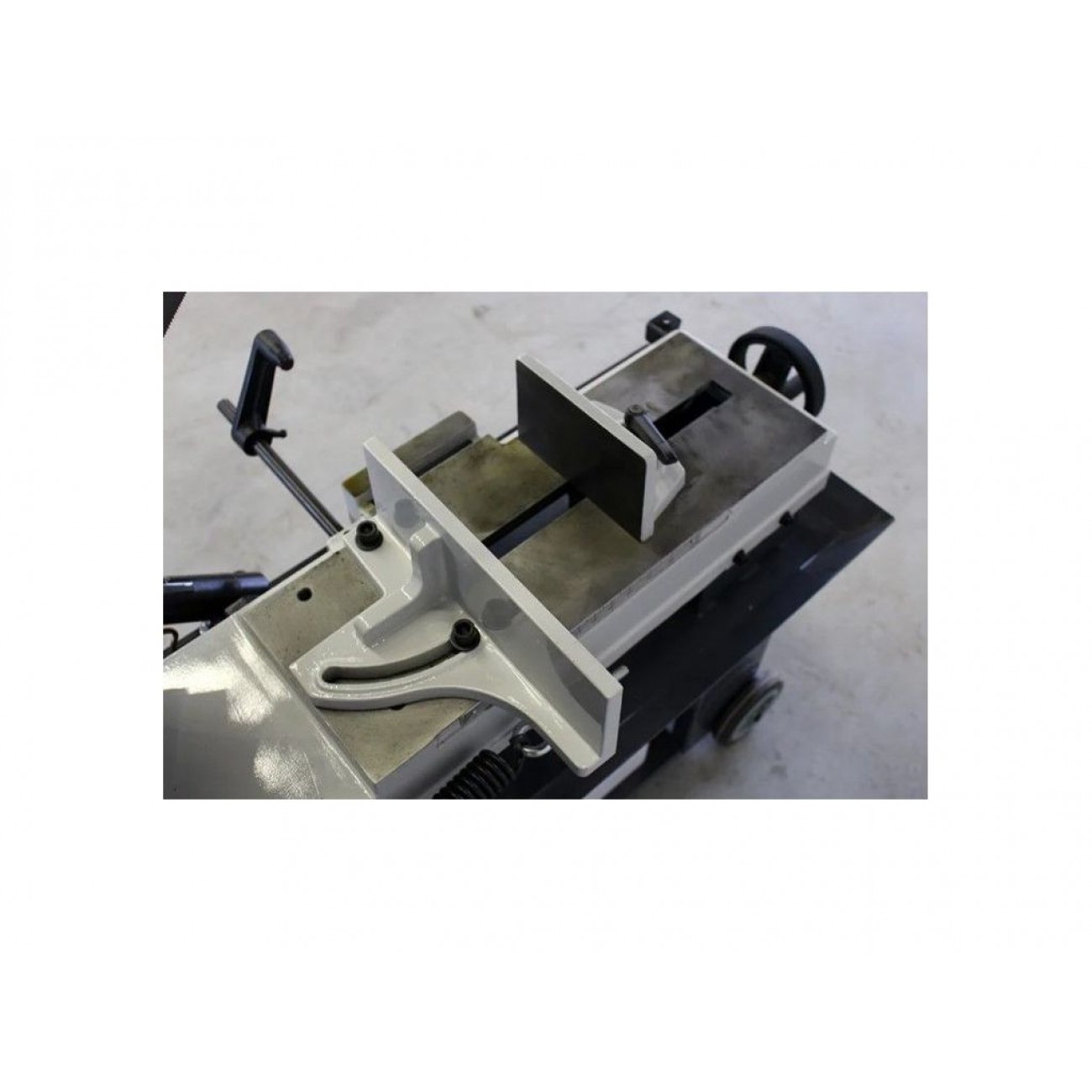 Пила обладнана поворотними лещатами, що дозволяє різати матеріал під кутом від 0 до 45 градусів, а міцна станина з чавунним робочим столом забезпечує стабільність роботи і гасить вібрації. Полотно висотою 20 мм виконує точний і чистий різ як металевого профілю, так і суцільних заготовок.