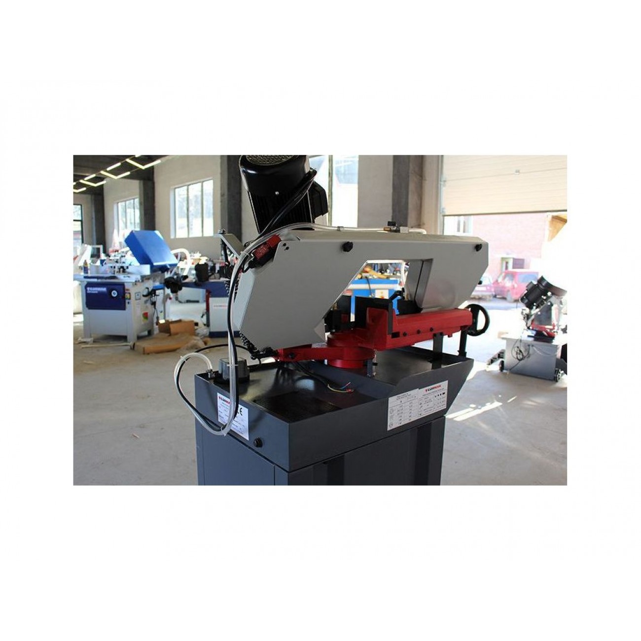 Основа з литого чавуну та високоякісна стрічка шириною 27 мм. Плавне опускання ріжучої голови за допомогою гідроциліндра дозволяє контролювати процес роботи. Завдяки індукційному двошвидкісному двигуну потужністю 1,1/1,5 кВт із захистом від перегріву, верстат може тривало працювати без втрати ефективності. Оснащений захисними пристроями для безпеки оператора та манометром, який дозволяє слідкувати за натягом полотна.