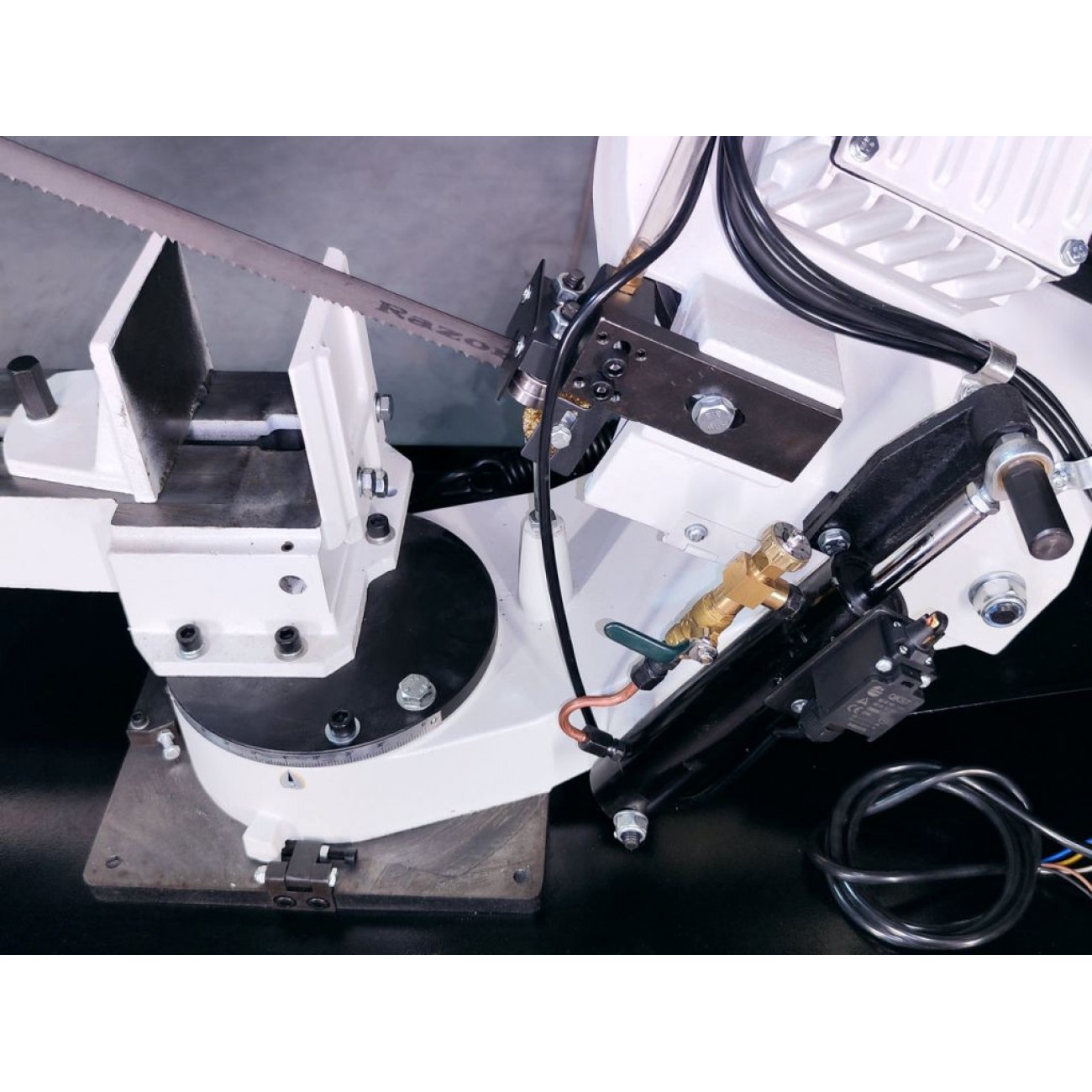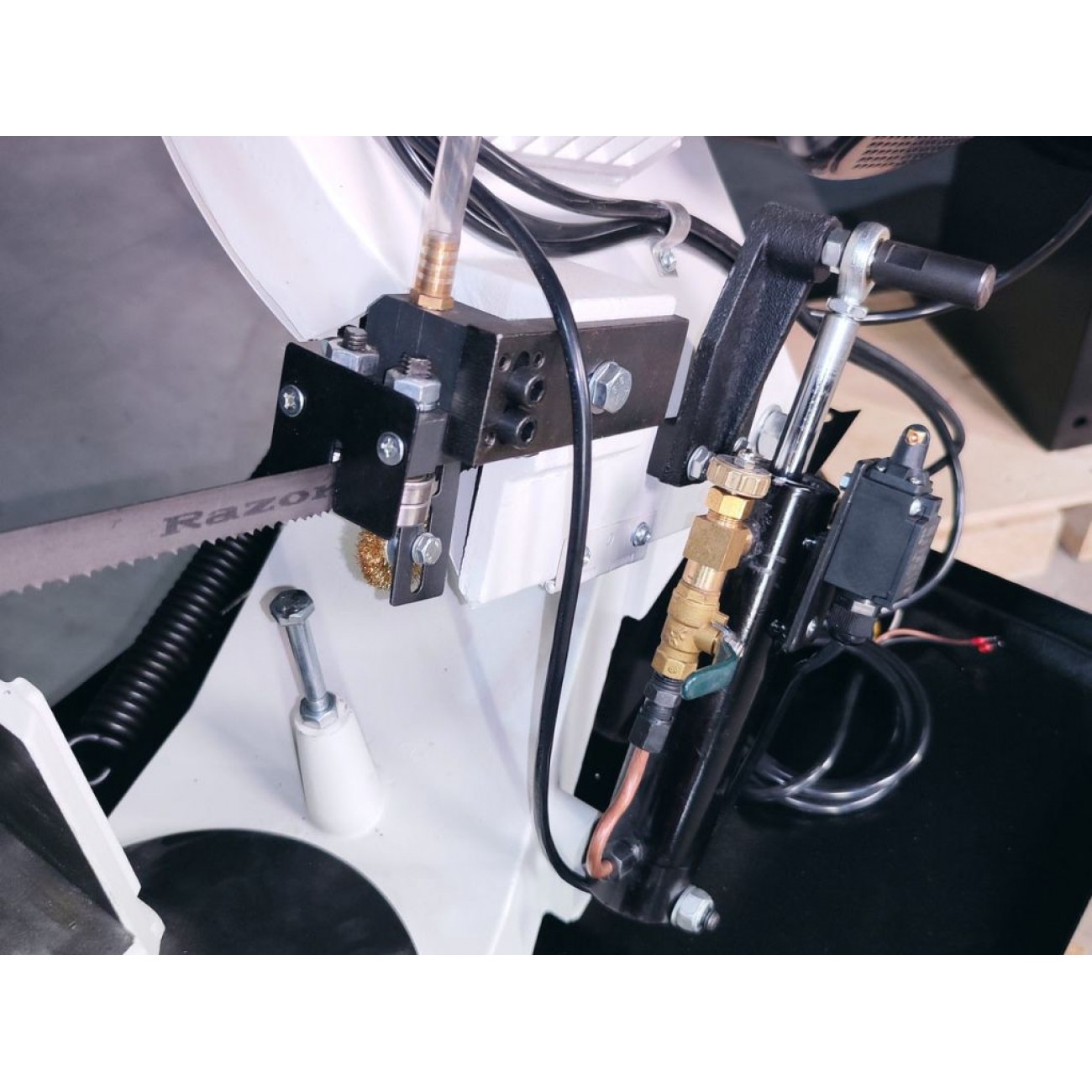 - Безступінчасте регулювання опускання пильної рами за допомогою гідроциліндра