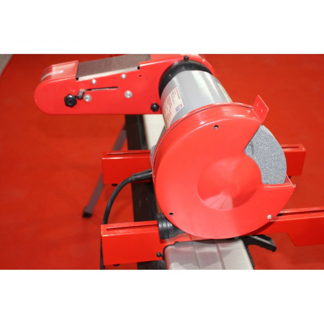 Верстат поставляється з універсальною шліфувальною стрічкою зернистістю 80 і шліфувальним кругом із зерном K36. Шліфувальні елементи можна легко замінити за допомогою спеціального важеля. Кут нахилу стрічкового блока регулюється від 0° до 90°, а тримач заготовки можна повертати до 45°. Литий чавунний корпус з високою вібростійкістю і промисловий дизайн забезпечують високу точність обробки. Для захисту вiд стружки та іскор є захисний щиток з плексигласу. Монтажні отвори в корпусі дозволяють надійно закріпити пристрій на поверхні, а компактний розмір і легке налаштування - використовувати цей настільний шліфувальний верстат по металу у будь-якому зручному місці.