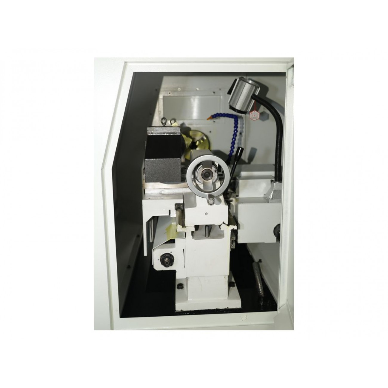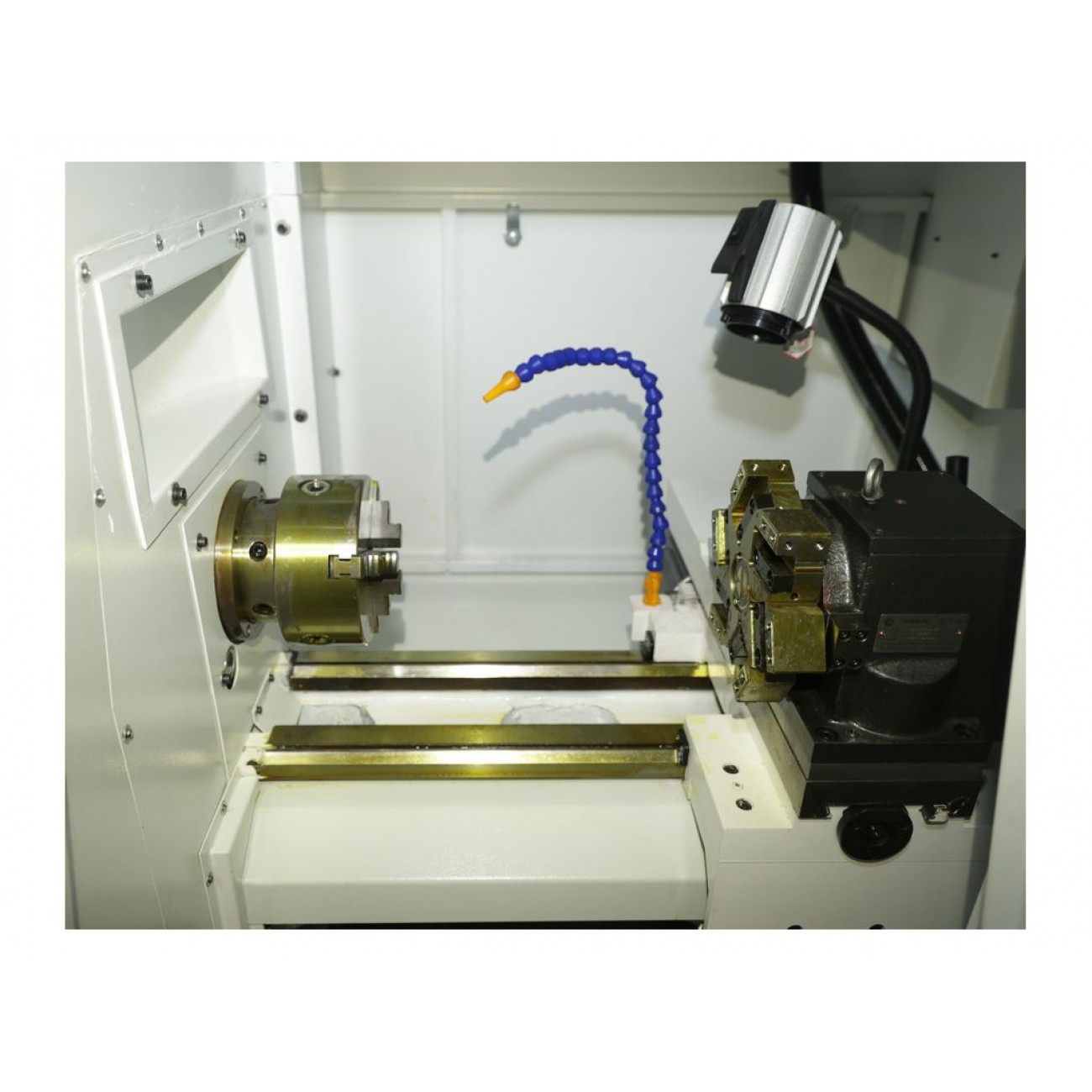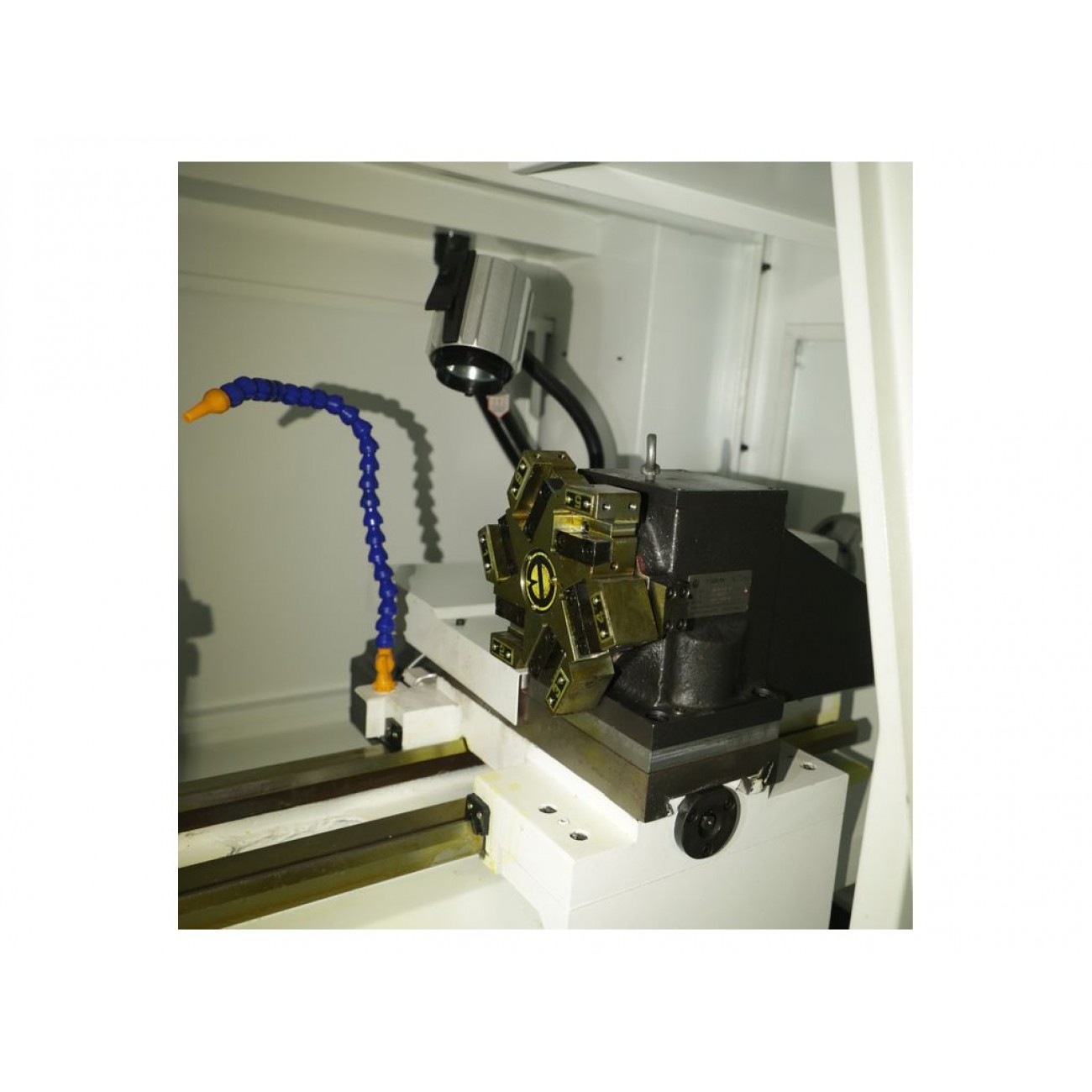 масивна лита чавунна станина з товщиною стінок 20-25 мм, посилена ребрами жорсткості, відшліфовані та індукційно загартовані напрямні для покращення ковзання вузлів поздовжньої і поперечної подачі, 6-позиційний револьвер зі швидкою заміною інструменту та автоматична система змащування. Швидкість обертання шпинделя регулюється у діапазоні 100-2500 об/хв. Цей токарний ЧПУ верстат буде ефективним для всіх металообробних виробництв.