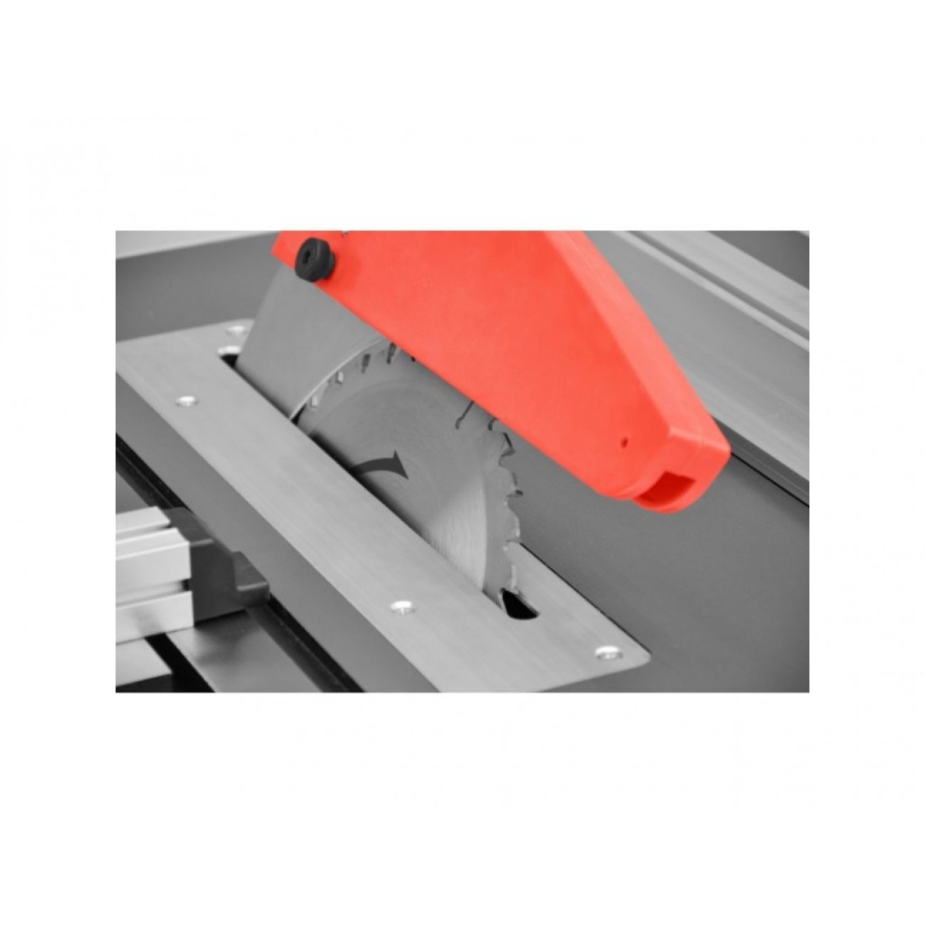 Робочий стіл циркулярної пилки по дереву, виготовлений зі сталі з антикорозійним покриттям, має розширення, оснащене паралельним упором, який легко переміщається по напрямних і фіксується ексцентриковим затискачем.