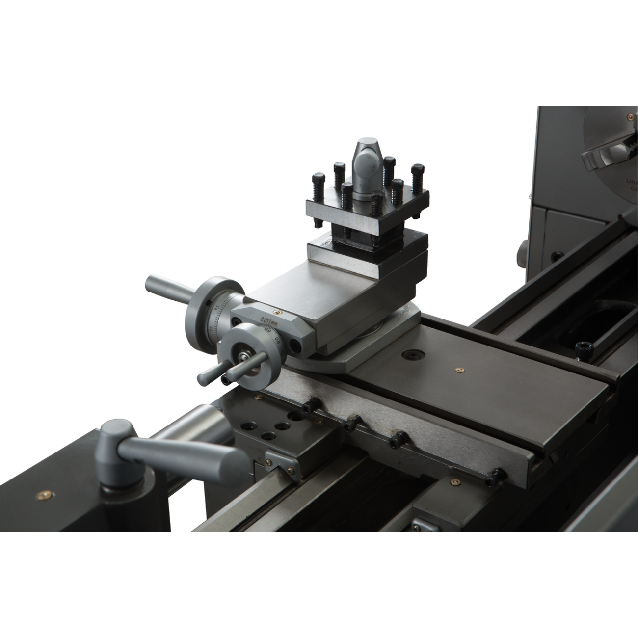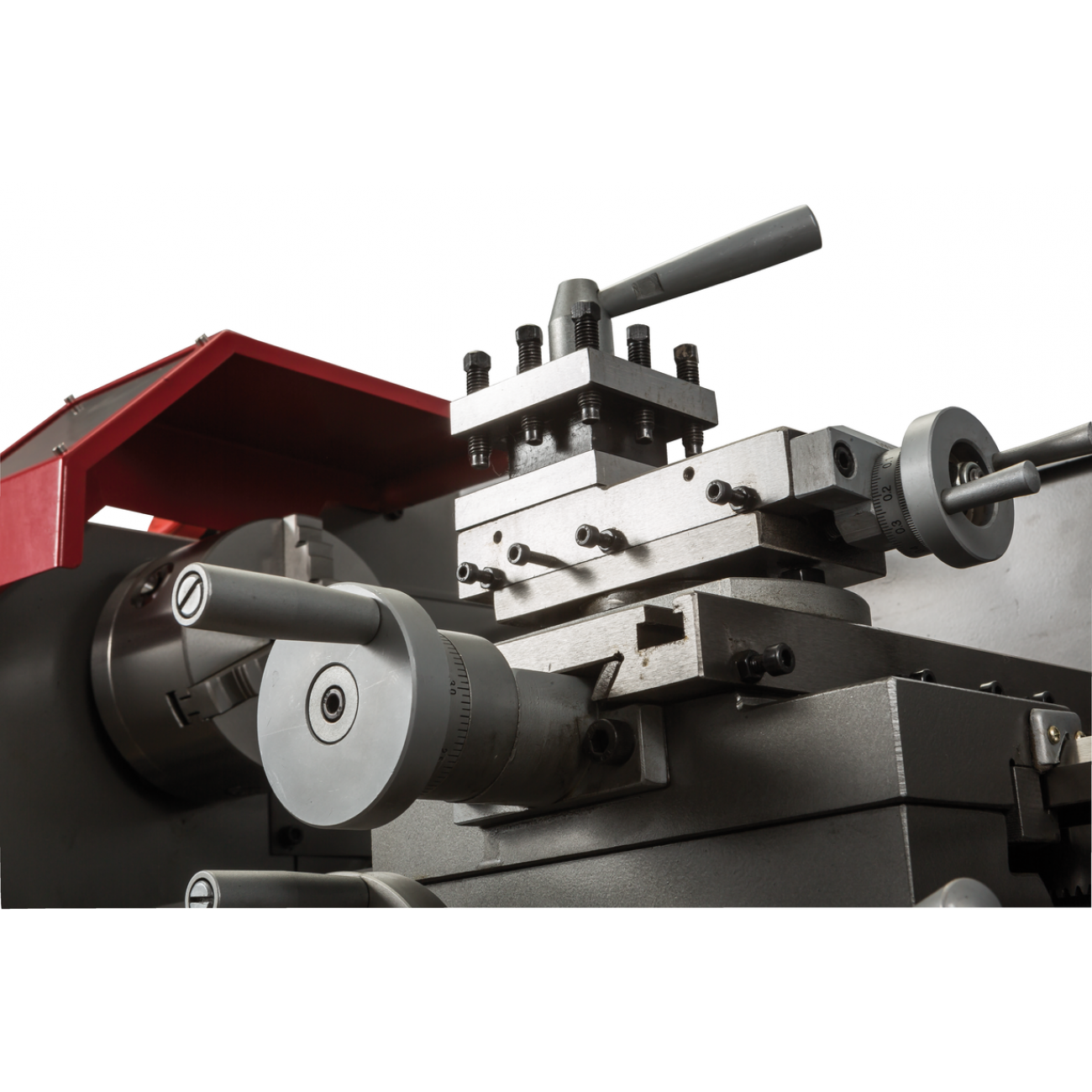 При цьому, у нас залишається можливість зміни напрямку обертання шпинделя, як за годинниковою стрілкою, так і проти годинникової стрілки. Можливість проточування малих конусів, за рахунок повороту каретки малої поздовжньої подачі. Можливість юстування задньої бабки на 10 мм в обидва боки. Можливість регулювання клинових планок на поперечній та малій поздовжній подачі, та багато іншого.