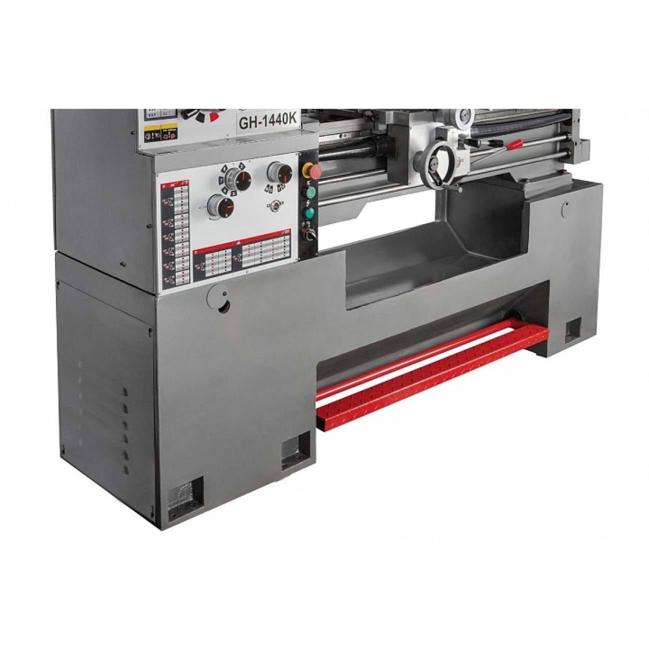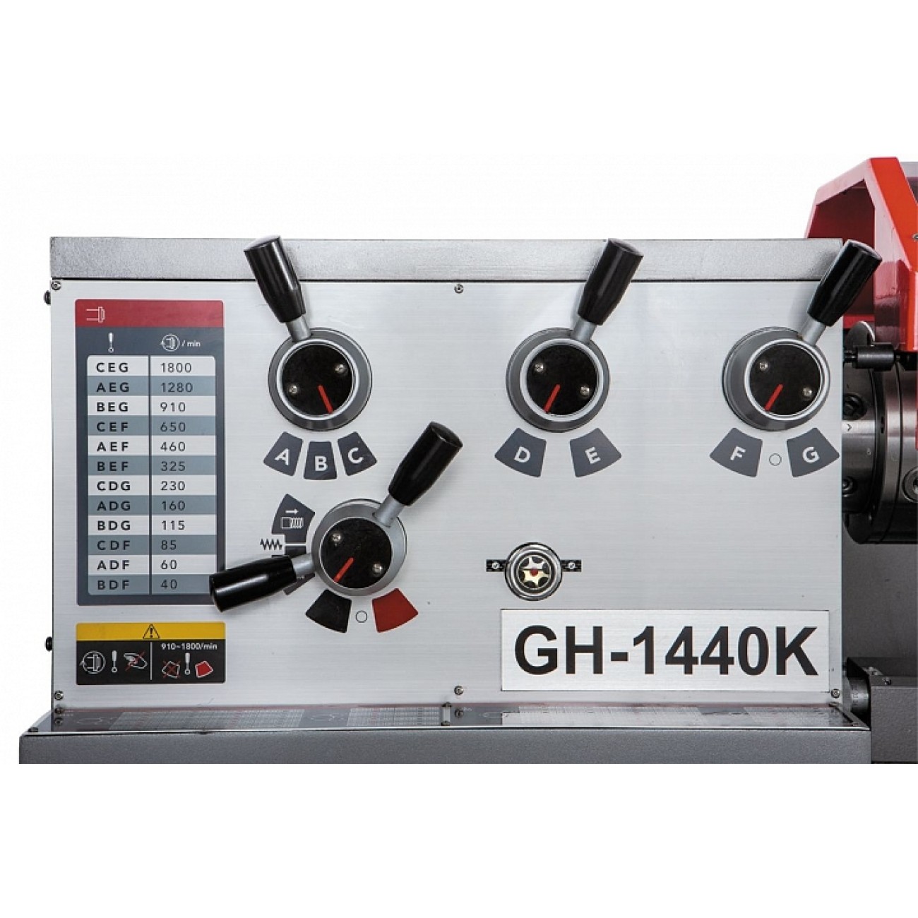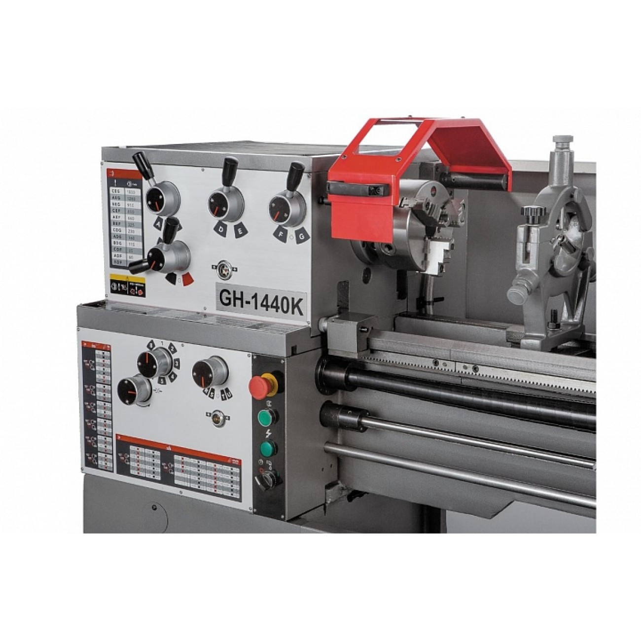 Відстань між центрами – 1000 мм. JET GH-1440К встановлюється на масивну станину з чавуну, її напрямні загартовані струмами високої частоти та відшліфовані. JET GH-1440K має 40 типів поздовжніх та поперечних подач в автоматичному режимі, а також дозволяє нарізати метричні та дюймові різьблення. Оберти шпинделя можна вибирати з 12 встановлених режимів в діапазоні від 40 до 1800 об/хв.