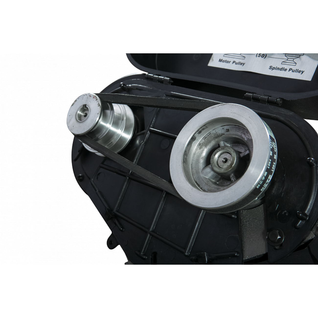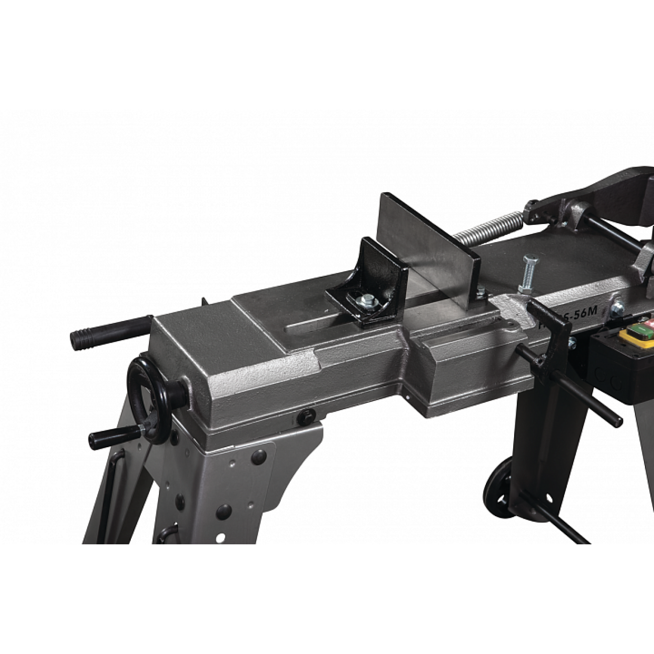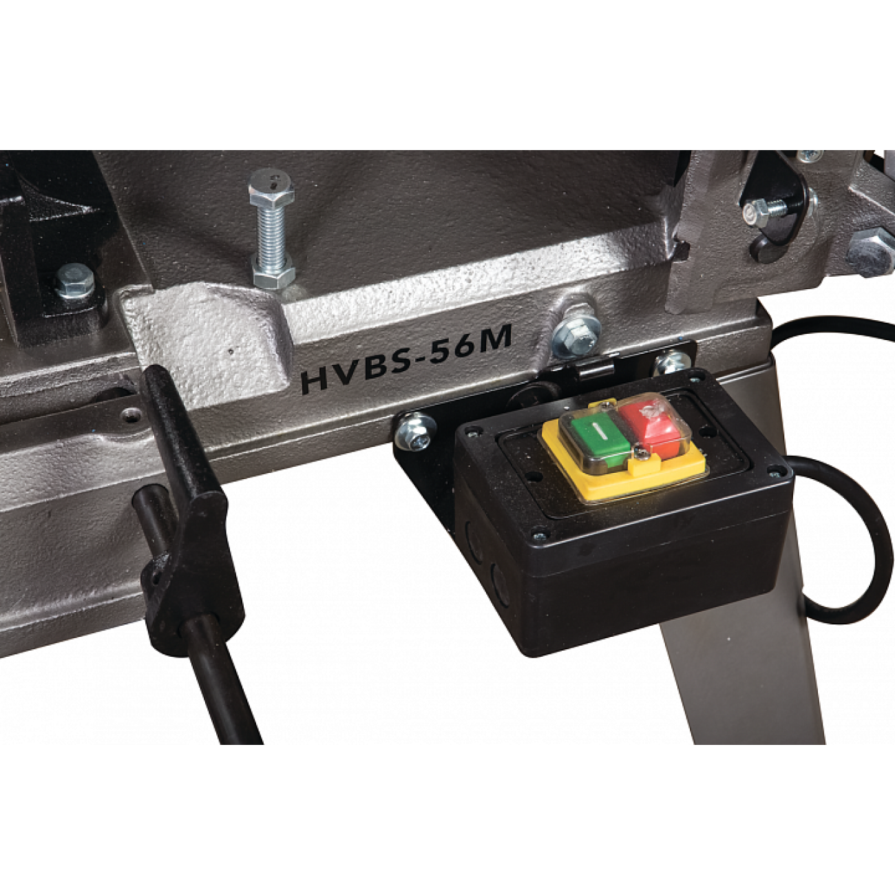Модель HVBS-56М оснащена компактним електродвигуном потужністю 650 Вт. Верстат має ремінний привід, що забезпечує рух стрічкового полотна в 3-х швидкісному режимі, 20,30 та 50 м/хв. Моторна група має систему повітряного охолодження. На рамі встановлені напрямні, що регулюють позиціонування полотна під час пиляння заготовок різного діаметра. Скорочення відстані між напрямними зменшує відведення полотна, підвищує якість розпилу. Необхідна точність розпилу досягається завдяки наявності у конструкції верстата підшипників, встановлених безпосередньо у напрямних. Завдання підшипників забезпечити постійне перпендикулярне положення полотна щодо заготівлі у процесі розпилу.