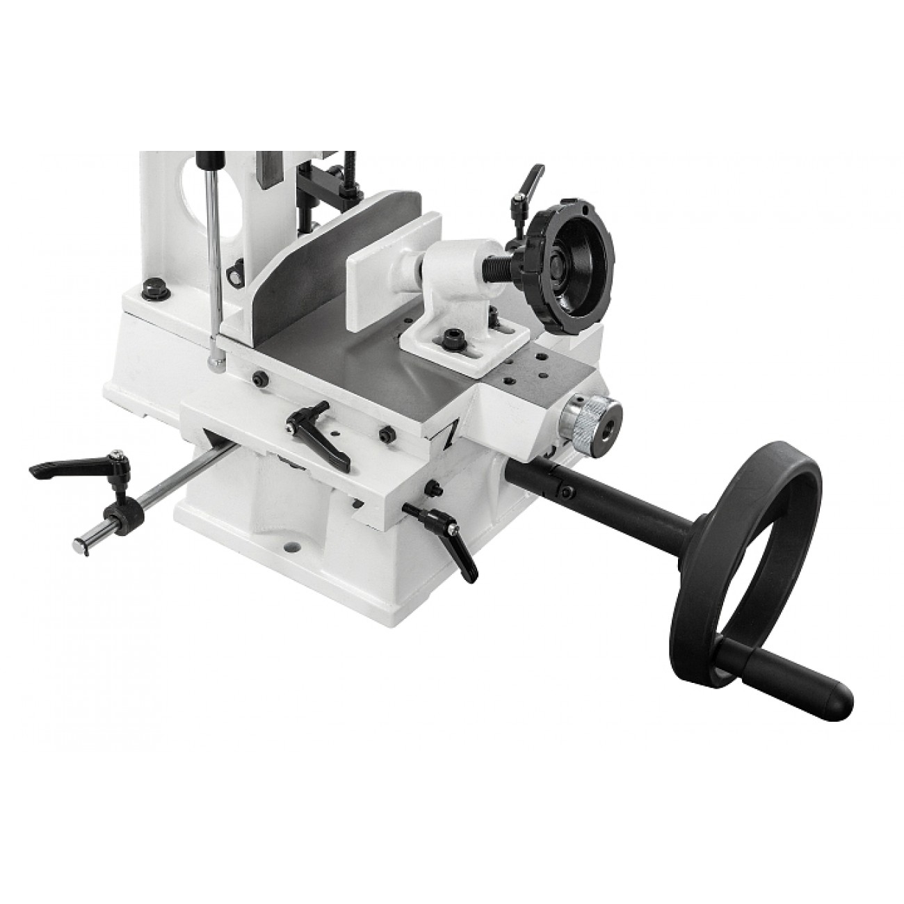 Заготовка размещается на координатном столе вдоль упора и фиксируется винтовым прижимом с наклонной осью. За перемещение вдоль отвечает большой маховик с рукояткой, крайние точки задают регулируемыми концевыми упорами. Движение поперек считается второстепенным и используется в основном для установки резца по центру заготовки, поэтому ходовой винт вращается не маховиком, а небольшой ручкой с накаткой. Все детали стола, включая упоры и прижимы, сделаны из чугуна, что обеспечивает жесткость и отсутствие вибраций при работе.