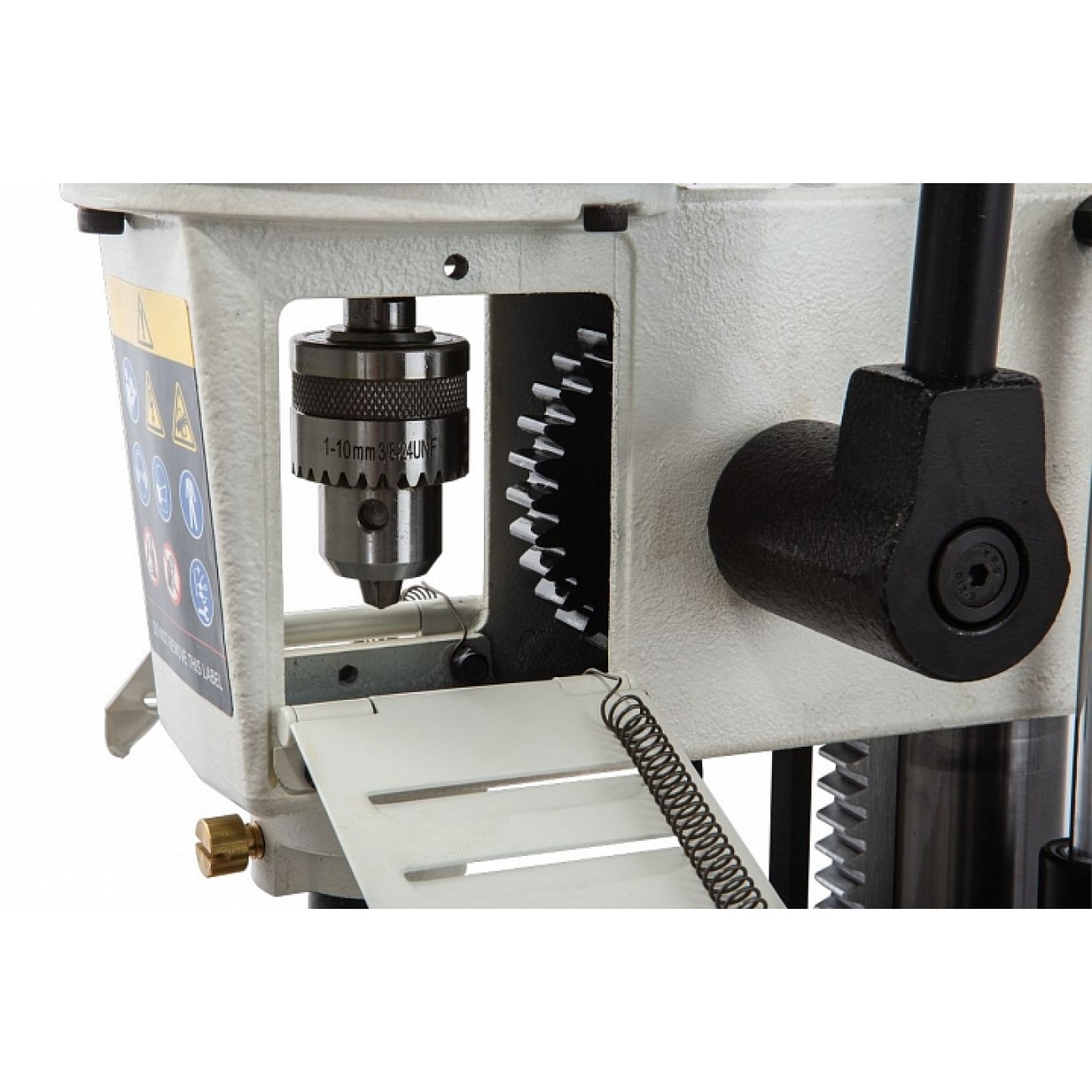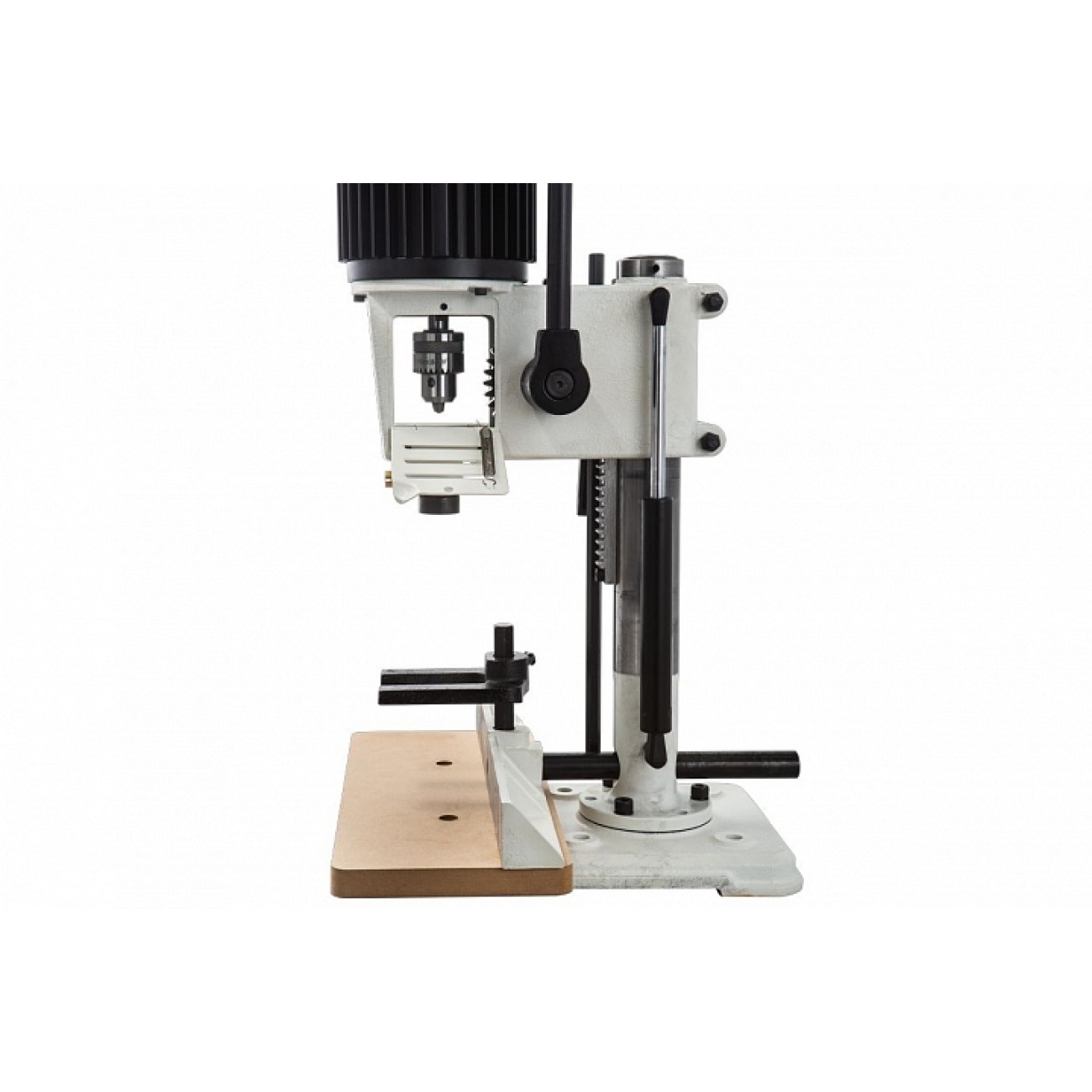JBM-5 сочетает удобство, простоту применения и мобильность станка для любительской эксплуатации с надёжностью и точностью профессионального оборудования. Среди вспомогательных систем, облегчающих работу, — газовая стойка, компенсатор веса моторной части, механизм подачи реечного типа с длинным рычагом, вертикальный прижим для фиксации заготовки и продольный упор. В комплекте поставляется набор переходных втулок для быстрой и точной установки сверла-долота.