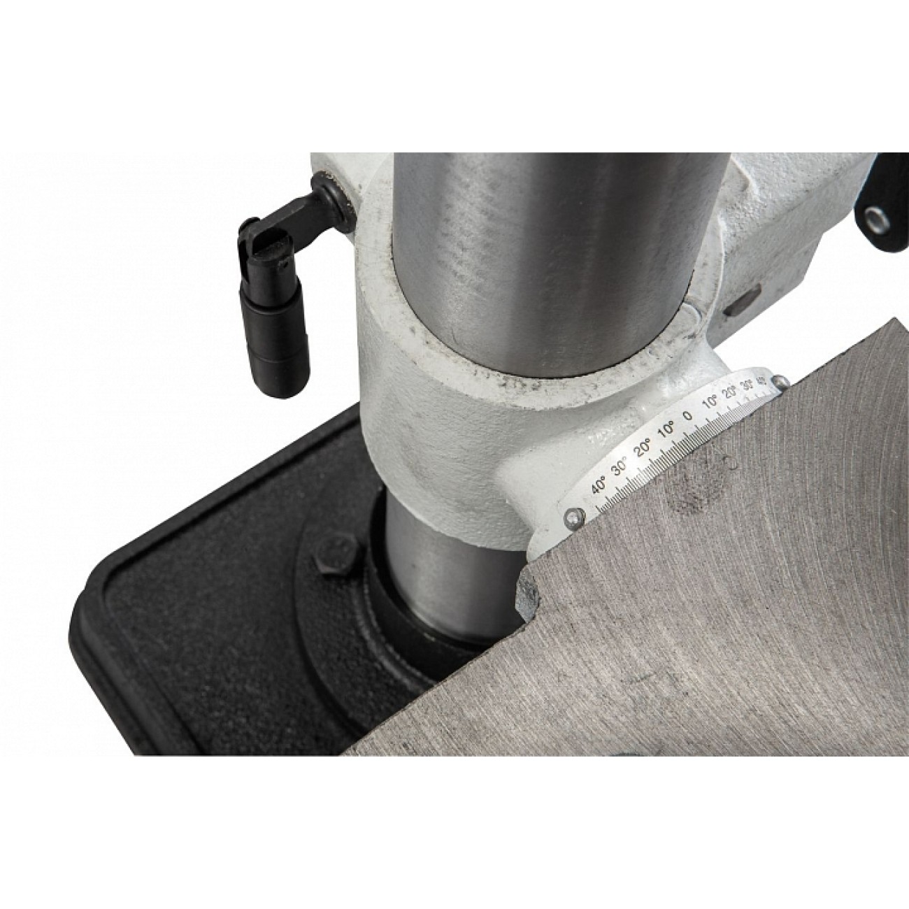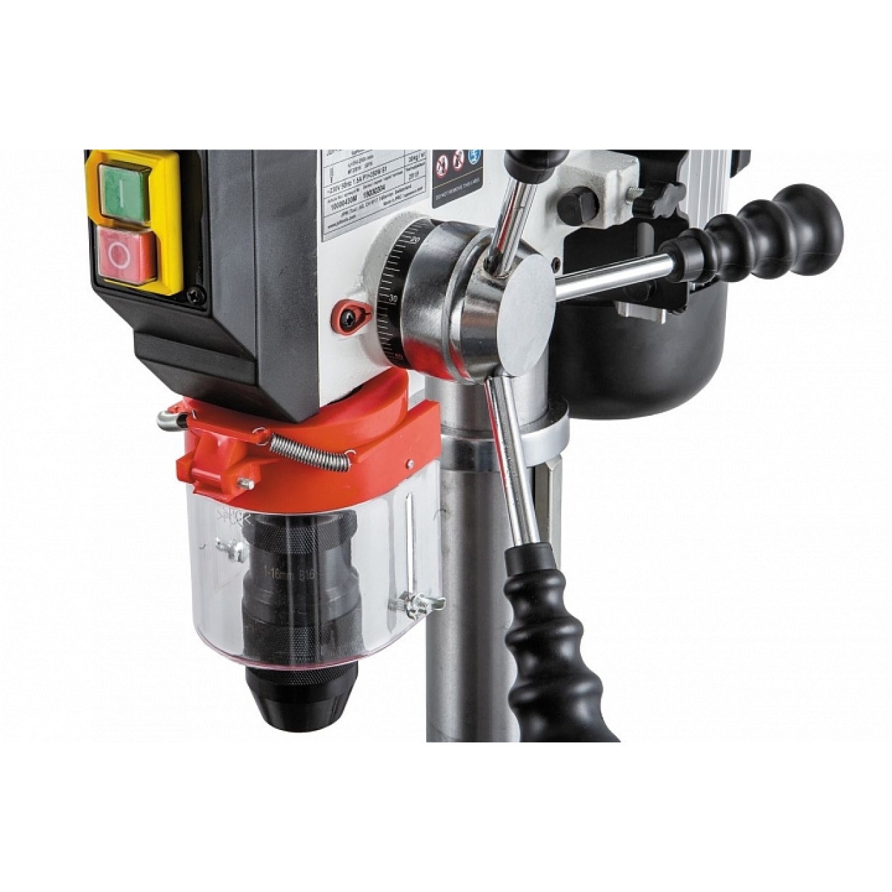 Рукоятка привода пиноли оборудована лимбом для контроля подачи и имеет встроенный ограничитель хода (глубины сверления). В штатный комплект поставки входят быстрозажимной патрон и станочные тиски Wilton, для крепления которых предусмотрены пазы на столе и на опорном основании станка.