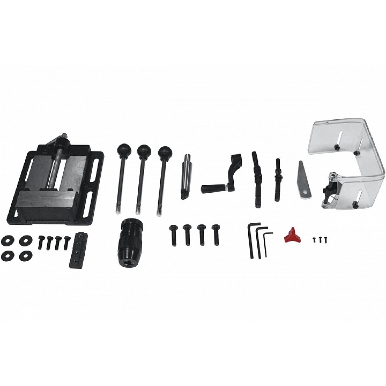 У комплекті поставляється швидкозатискний патрон з оправкою та лещата з монтажними елементами для фіксації в пазах столу або основи.