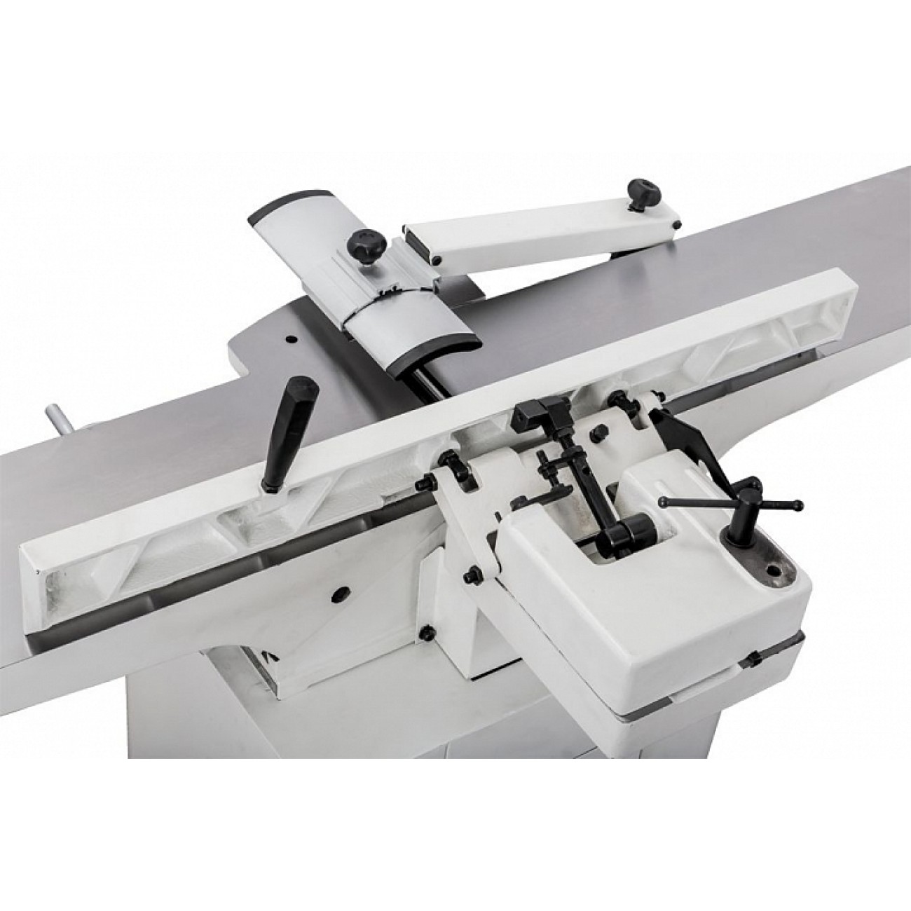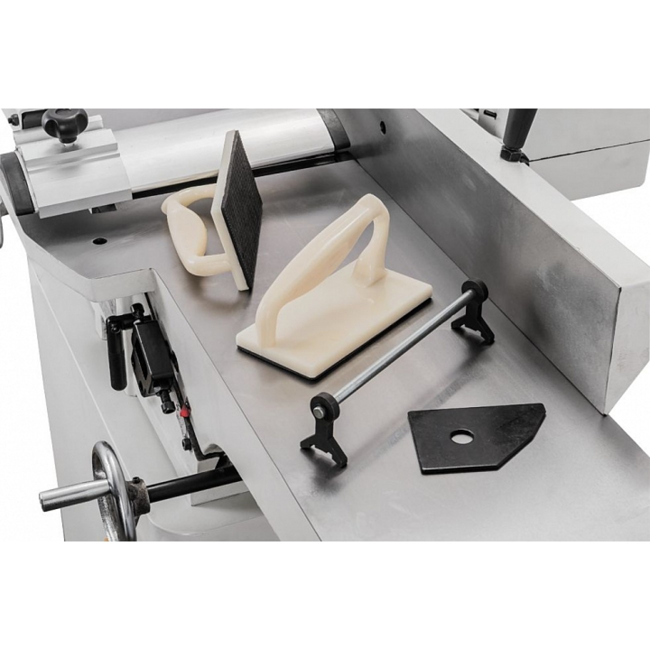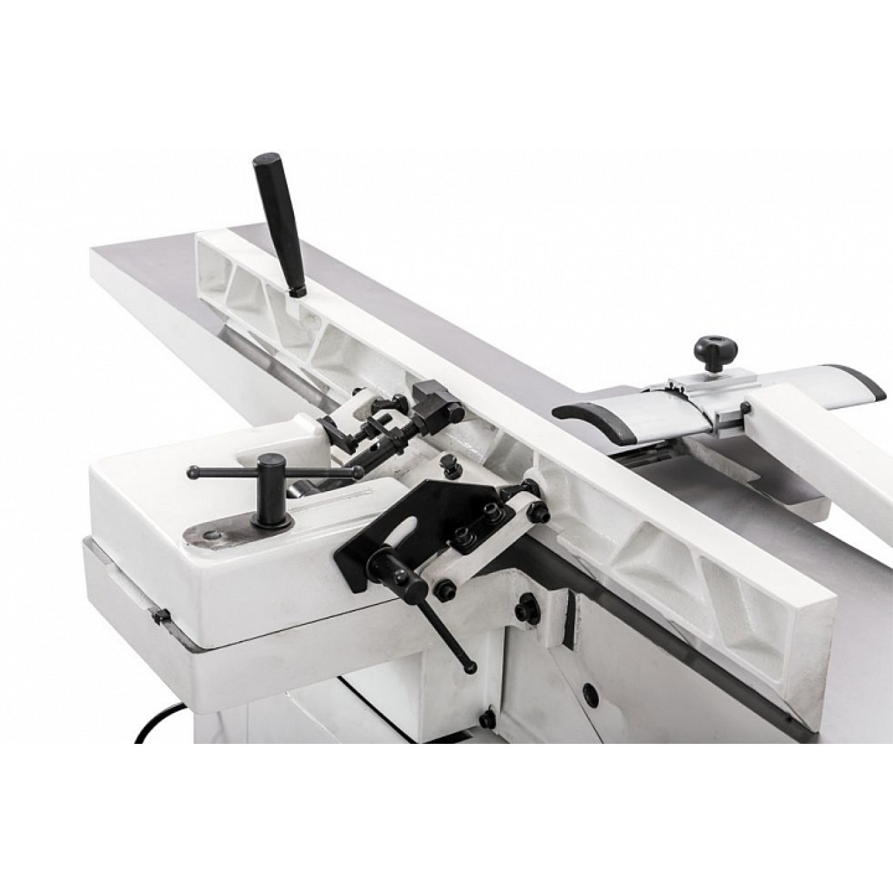 Обидва столи регулюються по висоті за допомогою гвинтових механізмів, що приводяться в дію ручками-маховиками. Переміщенням столу, що подає (переднього), встановлюють глибину стругання, для чого є відповідна розмітка; приймаючий (задній) регулюють тільки під час обслуговування верстата при операціях налагодження. Упор заготовки чавунний, з механізмом нахилу (він можливий обидві сторони). Фіксація обраного положення проводиться різьбовим затискачем. Ножовий вал укомплектований трьома ножами, що допускають повторне заточування. Їх типорозмір та асортимент такий же, як і у професійних фуганків Jet з аналогічною шириною стругання.