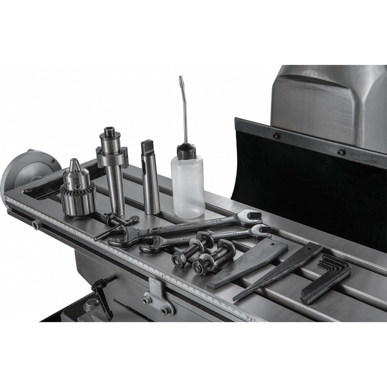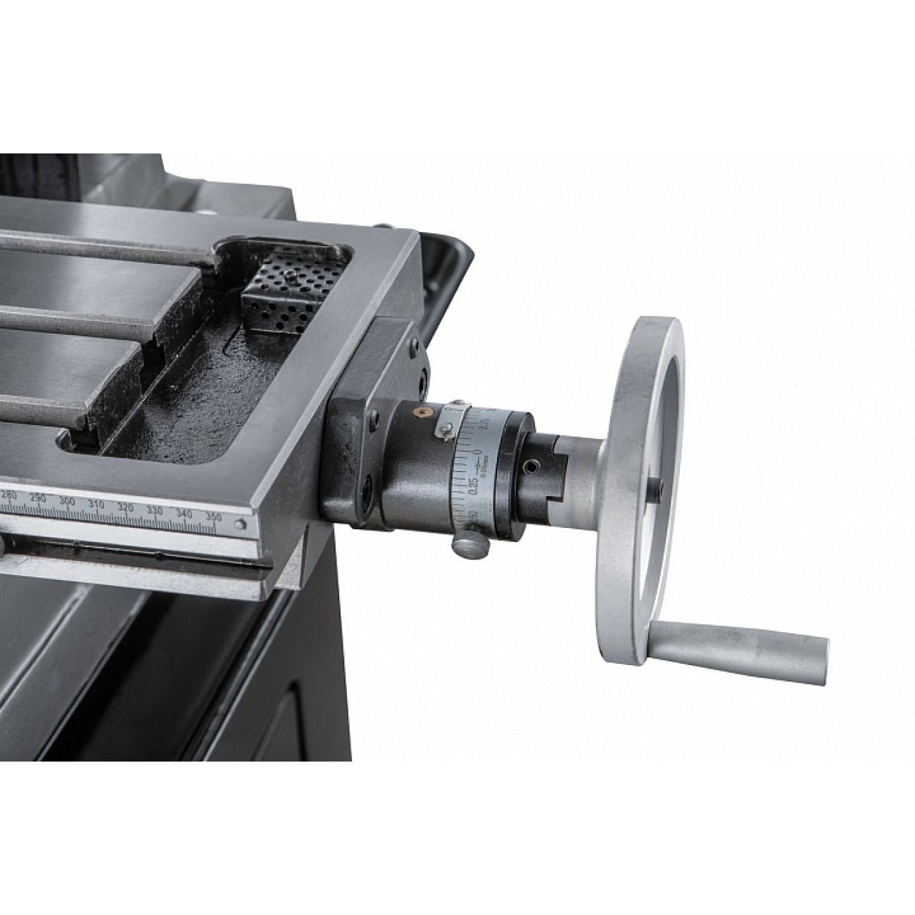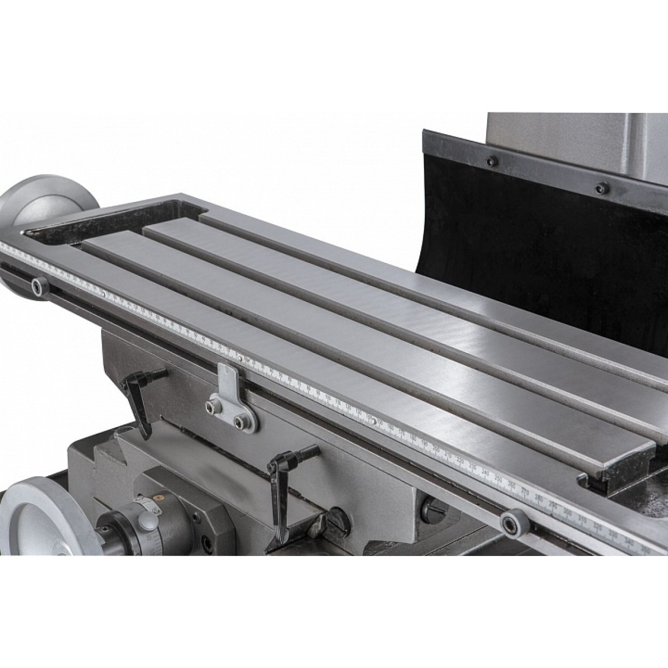 Станок имеет мощный крестовый стол с Т-образными пазами. Рабочий стол оснащен прецизионным механизмом перемещения. Количество пазов – 3 при ширине 14 мм. Вес станка 285 кг.