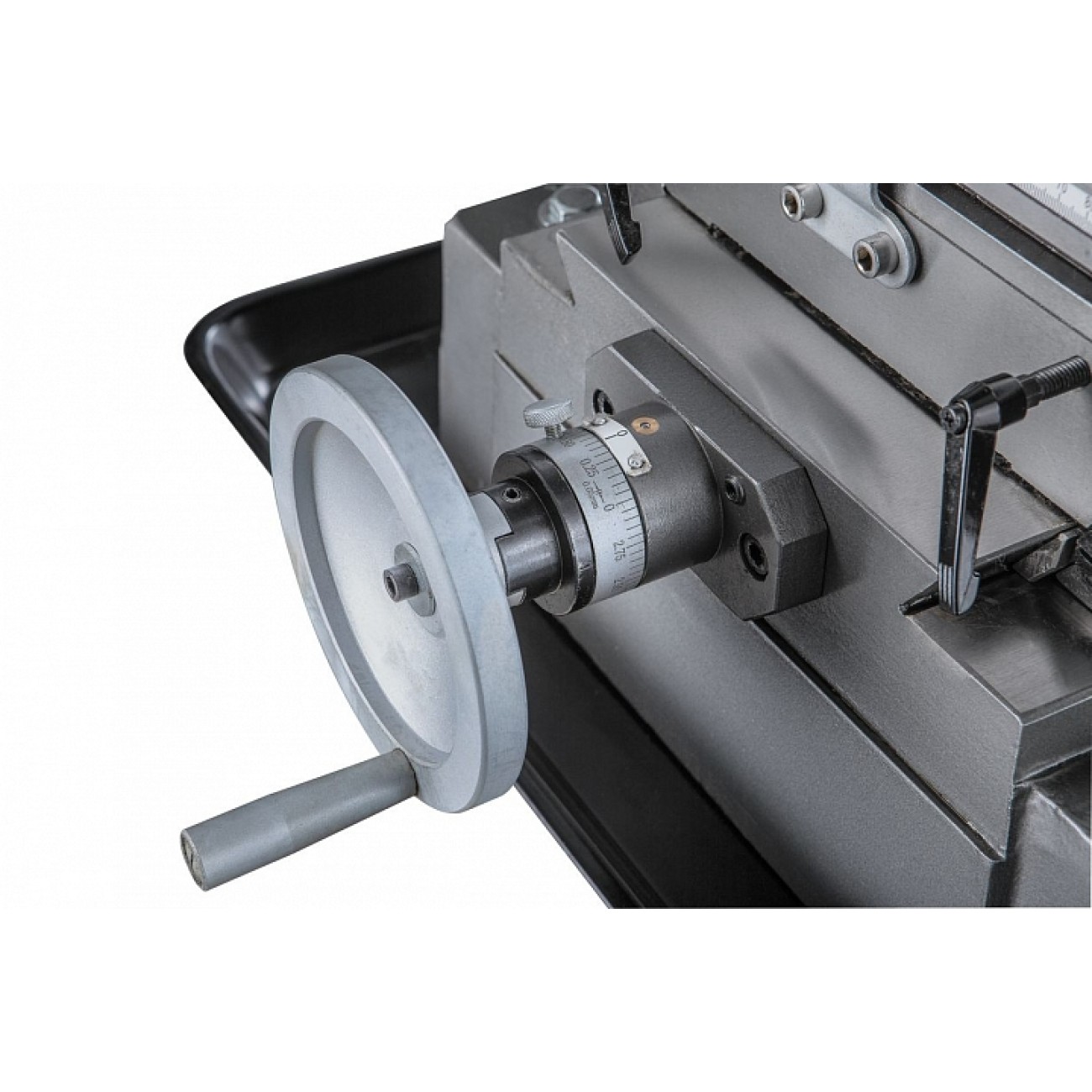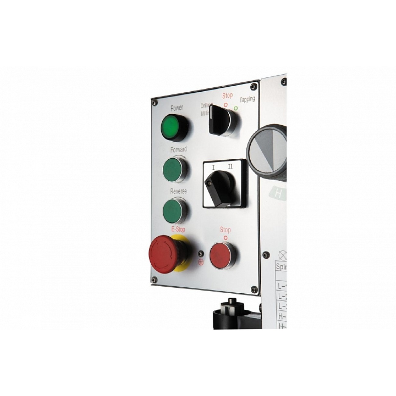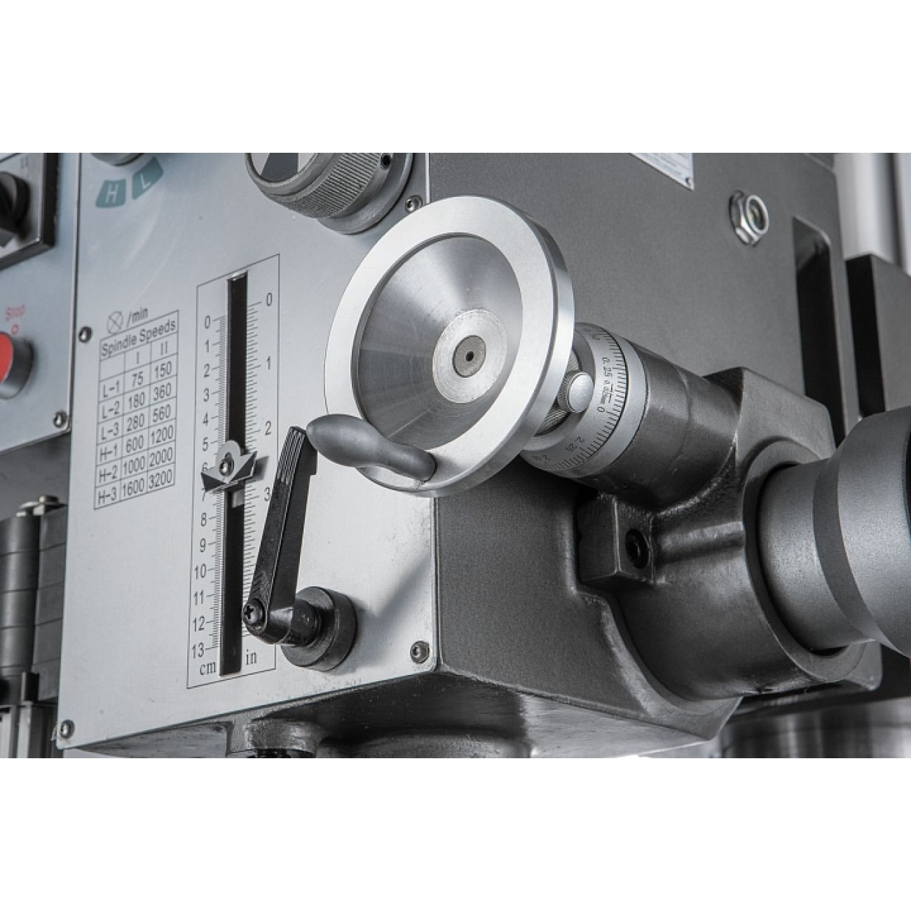 Модель оборудована мощным асинхронным электродвигателем - 1,1/1,5 кВт, обеспечивающий частоту вращения шпинделя в 2-х диапазонах 75-1600 об/мин и 150-3200 об/мин. Станок оборудован коробкой скоростей для выбора необходимой частоты вращения, по 6 скоростей в каждом из двух диапазонов. Функция включения реверса шпинделя позволяет осуществлять нарезание резьбы.
