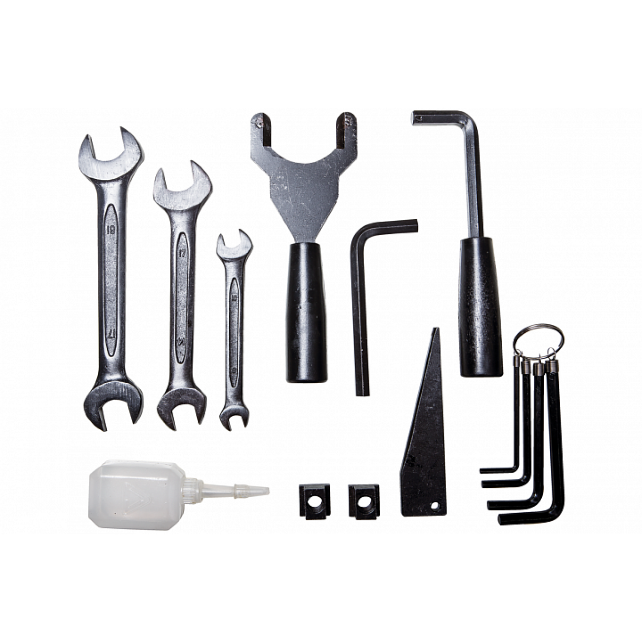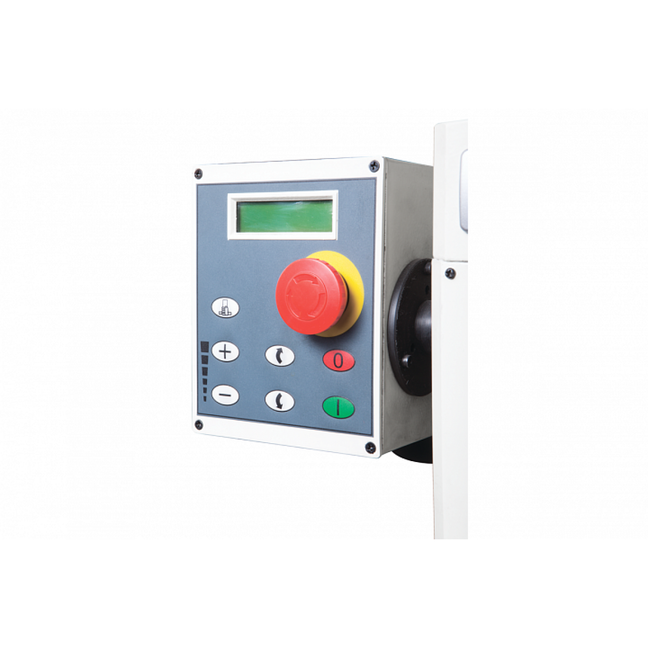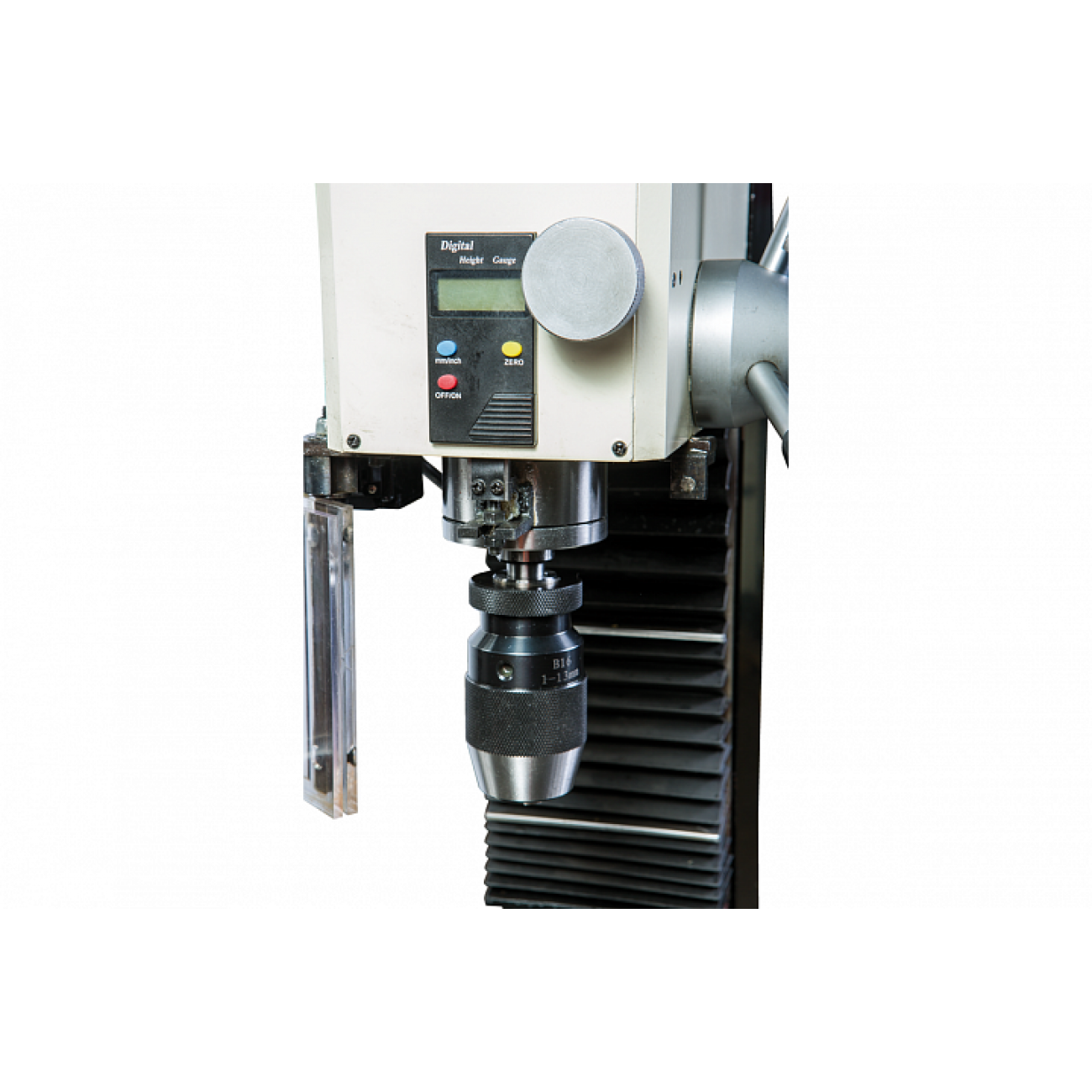 Реверс гарантує якість різьби, що нарізається, і зводить до мінімуму ймовірність зламати мічик. Крім того, передбачена можливість мікроподачі вильоту пінолі, це забезпечує особливо точне фрезерування або свердління на задану глибину. Верстат поставляється в гарній комплектації, до неї входять затискна тяга М10, патрон свердлильний B16 з оправкою, затискач від 1 до 13 мм, захисний екран, пульт управління з індикацією частоти обертання, цифровий індикатор переміщення пінолі і набір інструменту для обслуговування.