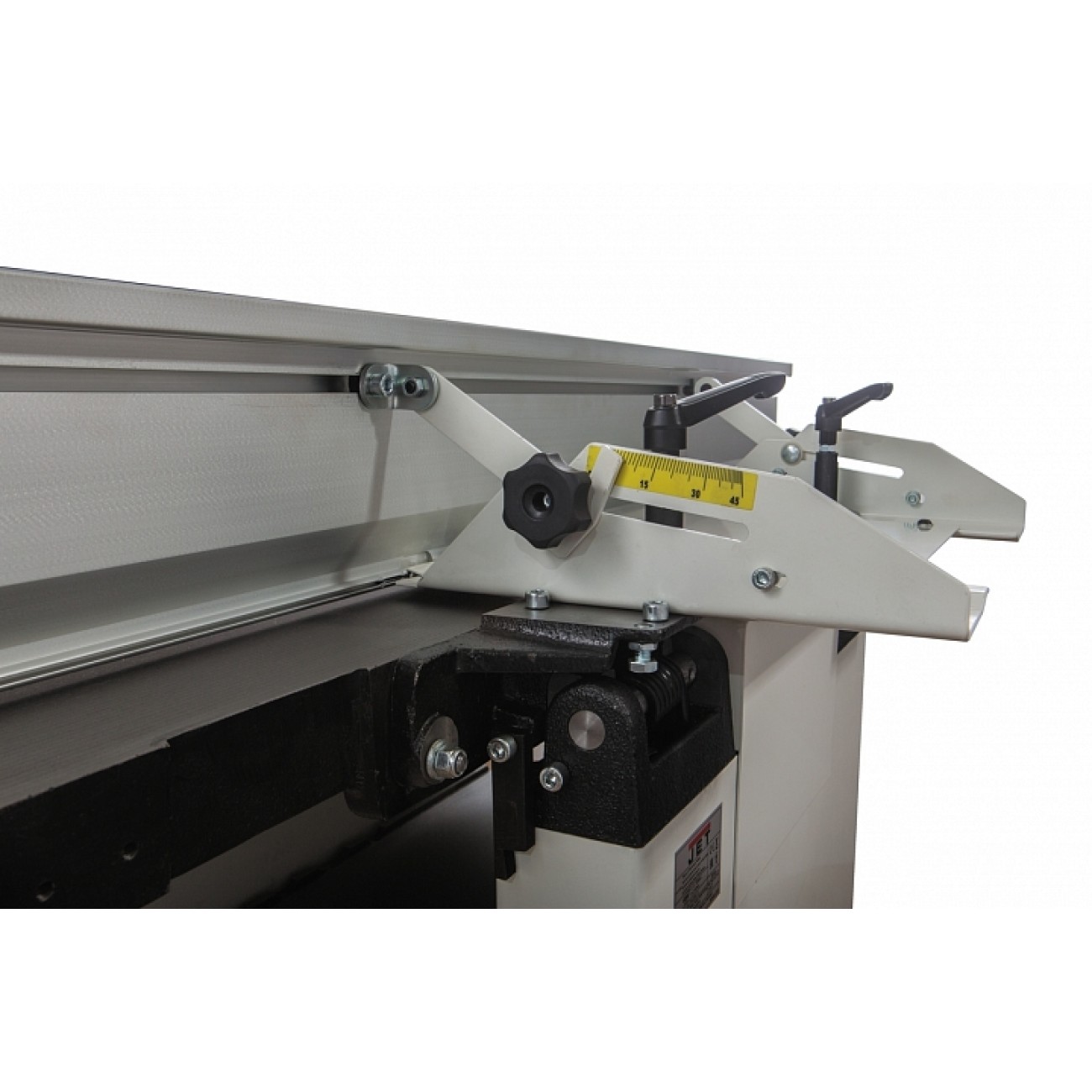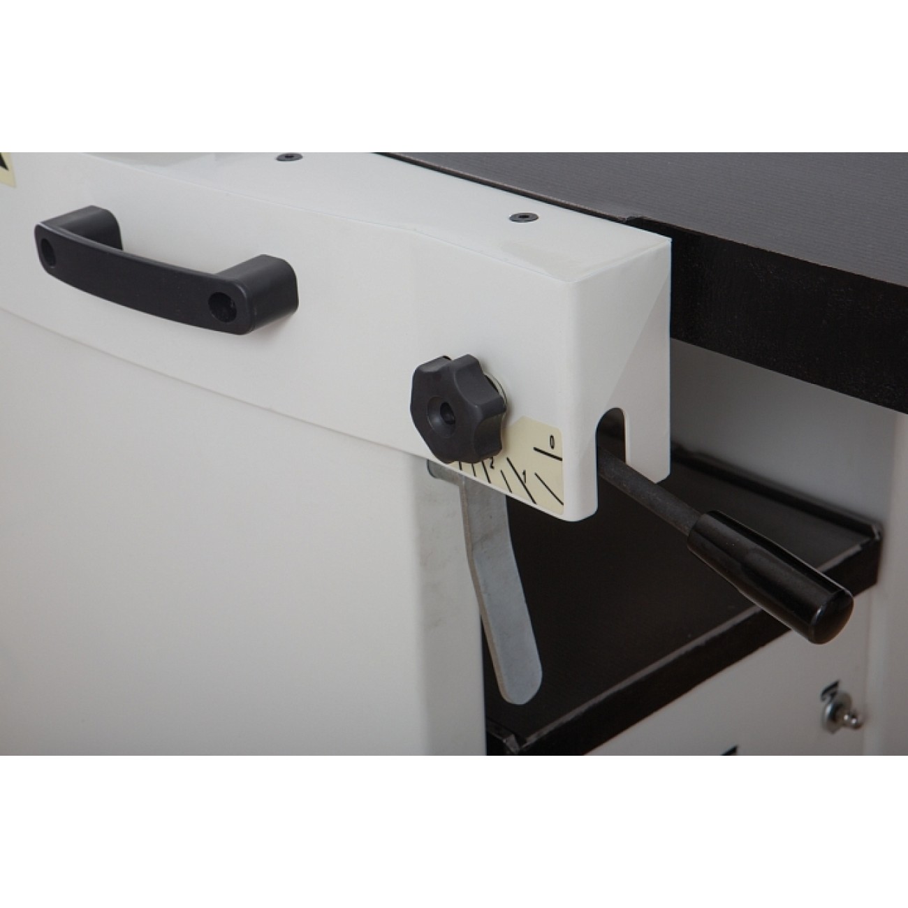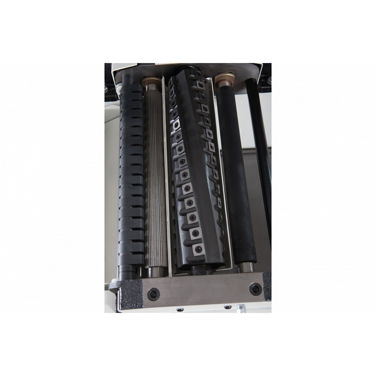 За основними характеристиками та зручністю роботи JPT-310HH не поступається окремим рейсмусом та фуганкою. Довгі та потужні чавунні столи створюють базу, достатню для роботи з деталями довжиною до 2-3 метрів. Щодо спеціалізованого верстата дещо полегшено фугувальний упор: він не з чавуну, а з алюмінієвого профілю. З іншого боку, ця модель має рідкісну перевагу: зручне ексцентрикове регулювання по висоті має не тільки подавальний, але і стіл, що приймає. Це необхідно, перш за все, при заміні стругального валу на helical, ріжучі пластини якого не регулюються по висоті.