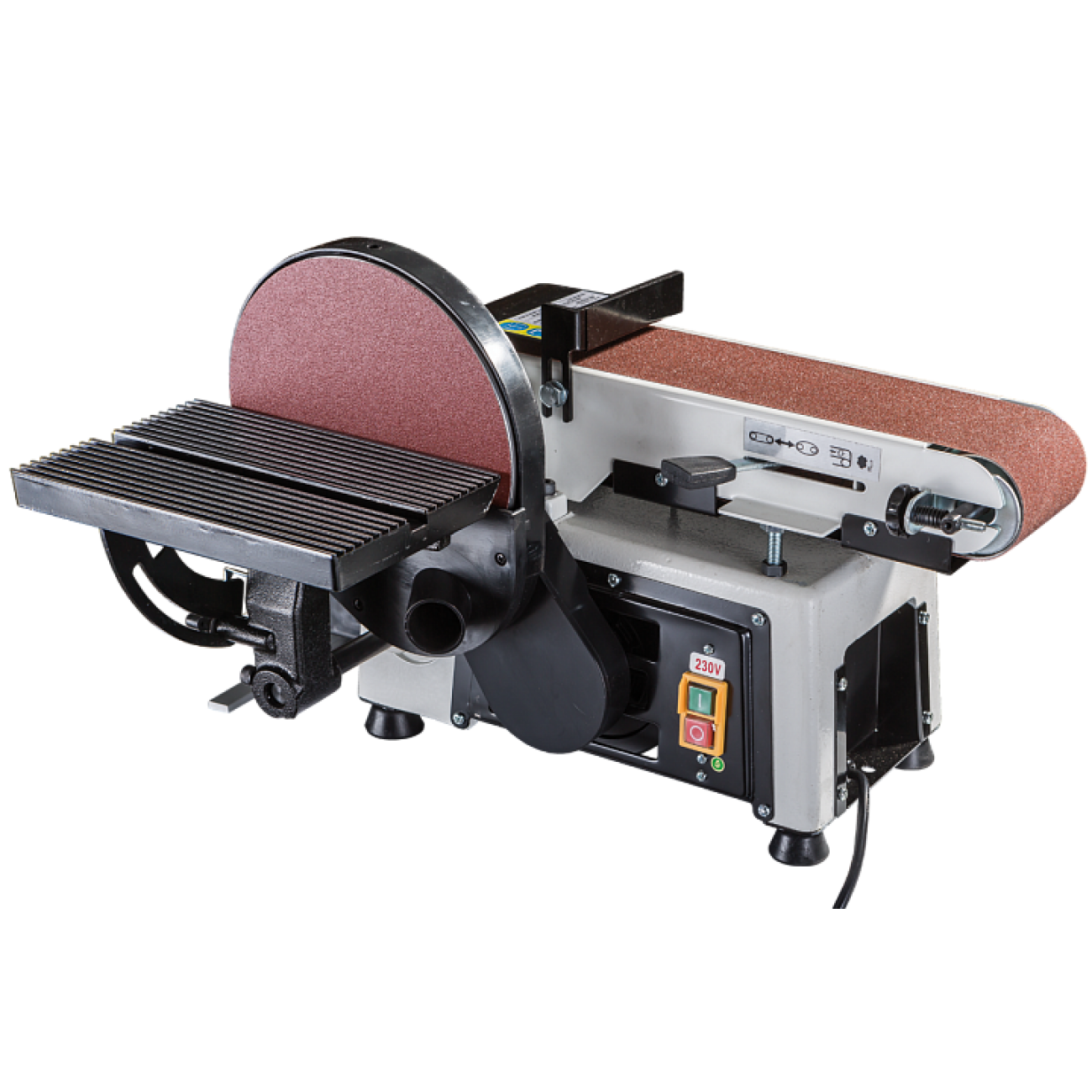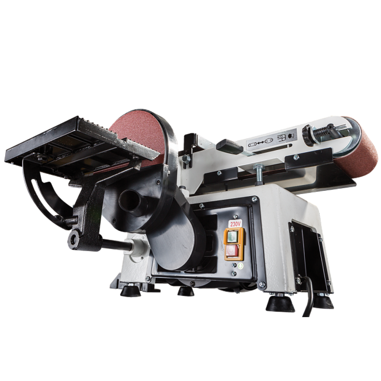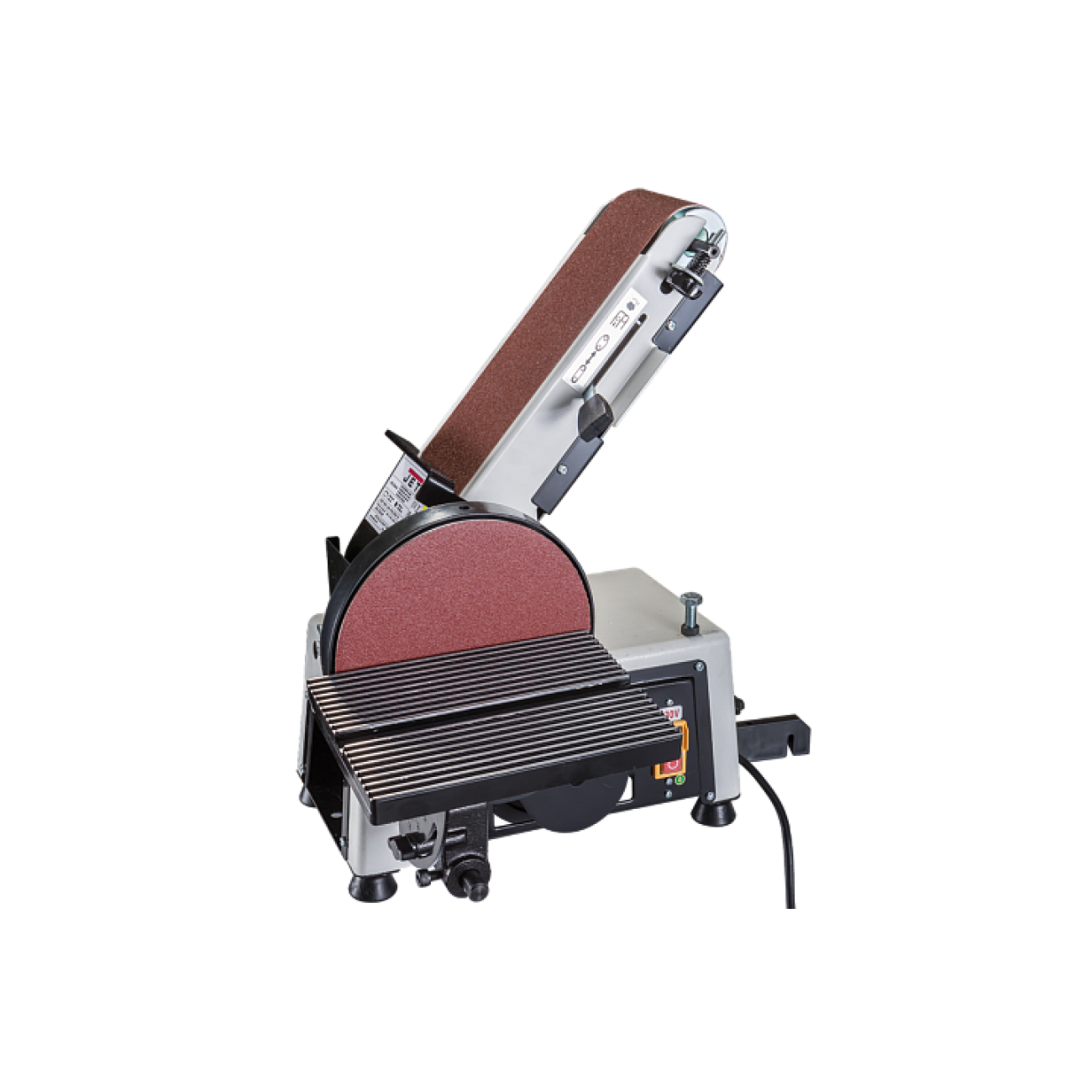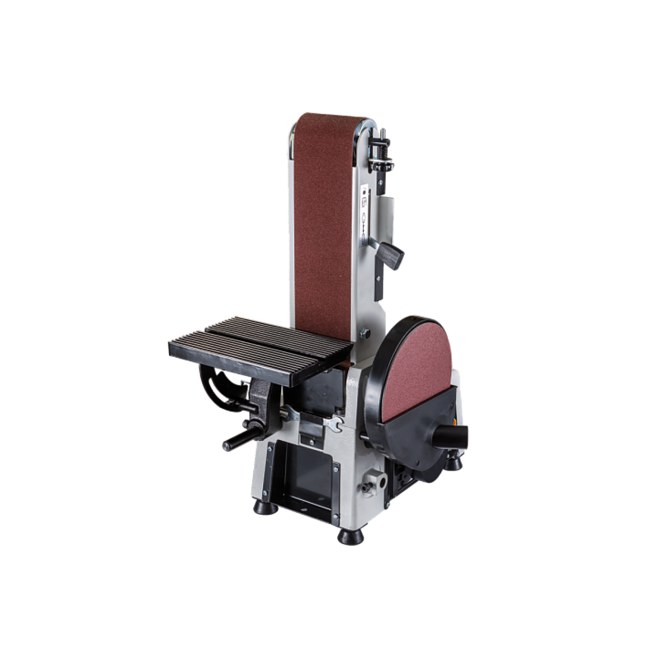 Тарельчато-ленточный шлифовальный станок JSG-233A-M для профессионального применения в частных столярных мастерских. Это относительно компактная модель, предназначенная для настольного размещения, но сделанная точно и основательно. Корпус выполнен литым из чугуна, что повышает устойчивость и способствует снижению вибраций при работе. Рабочий стол из алюминиевого литья и установлен на мощном поворотном кронштейне с дополнительной опорой, увеличивающей жесткость. В зависимости от необходимости его монтируют напротив тарельчатого или ленточного шлифовального узла.