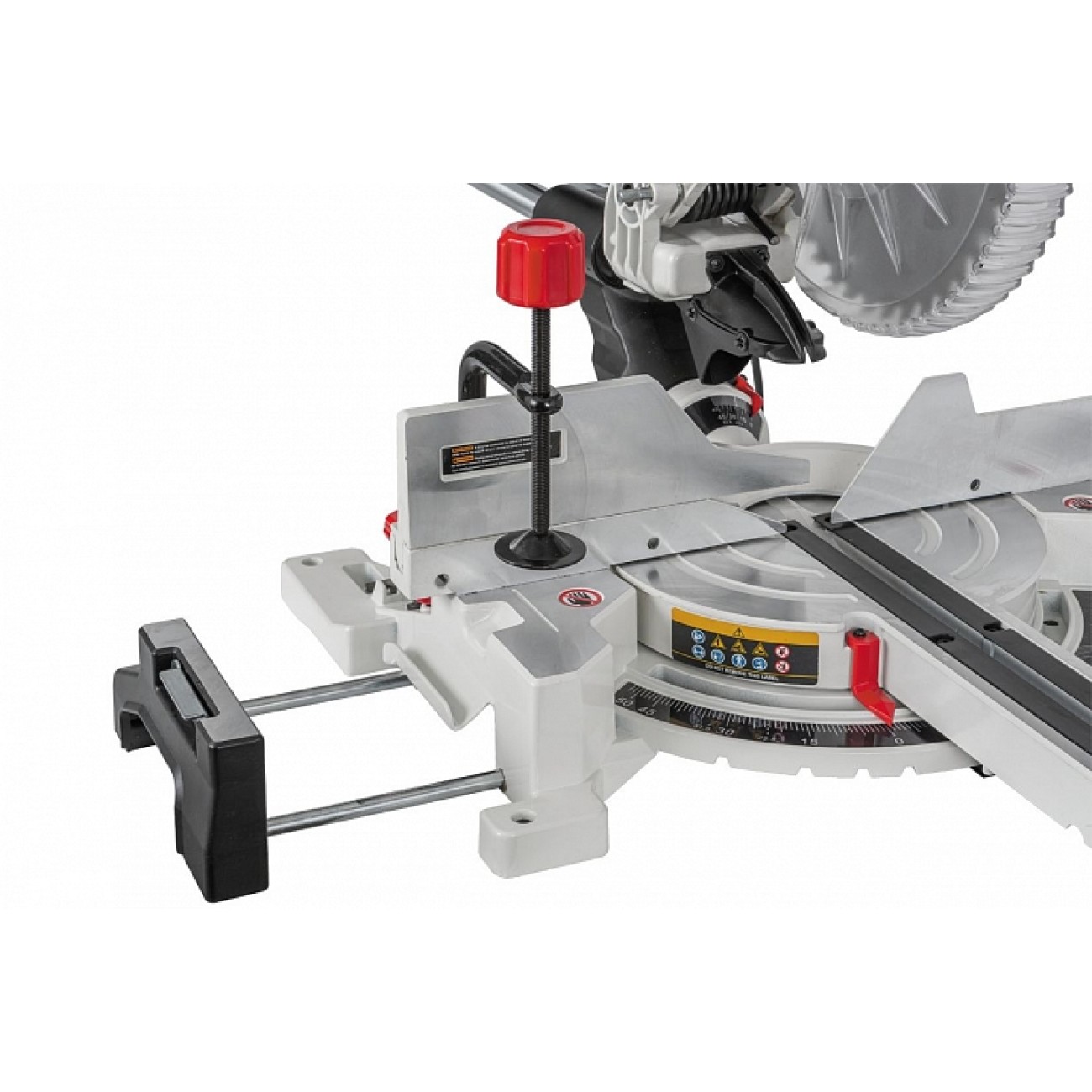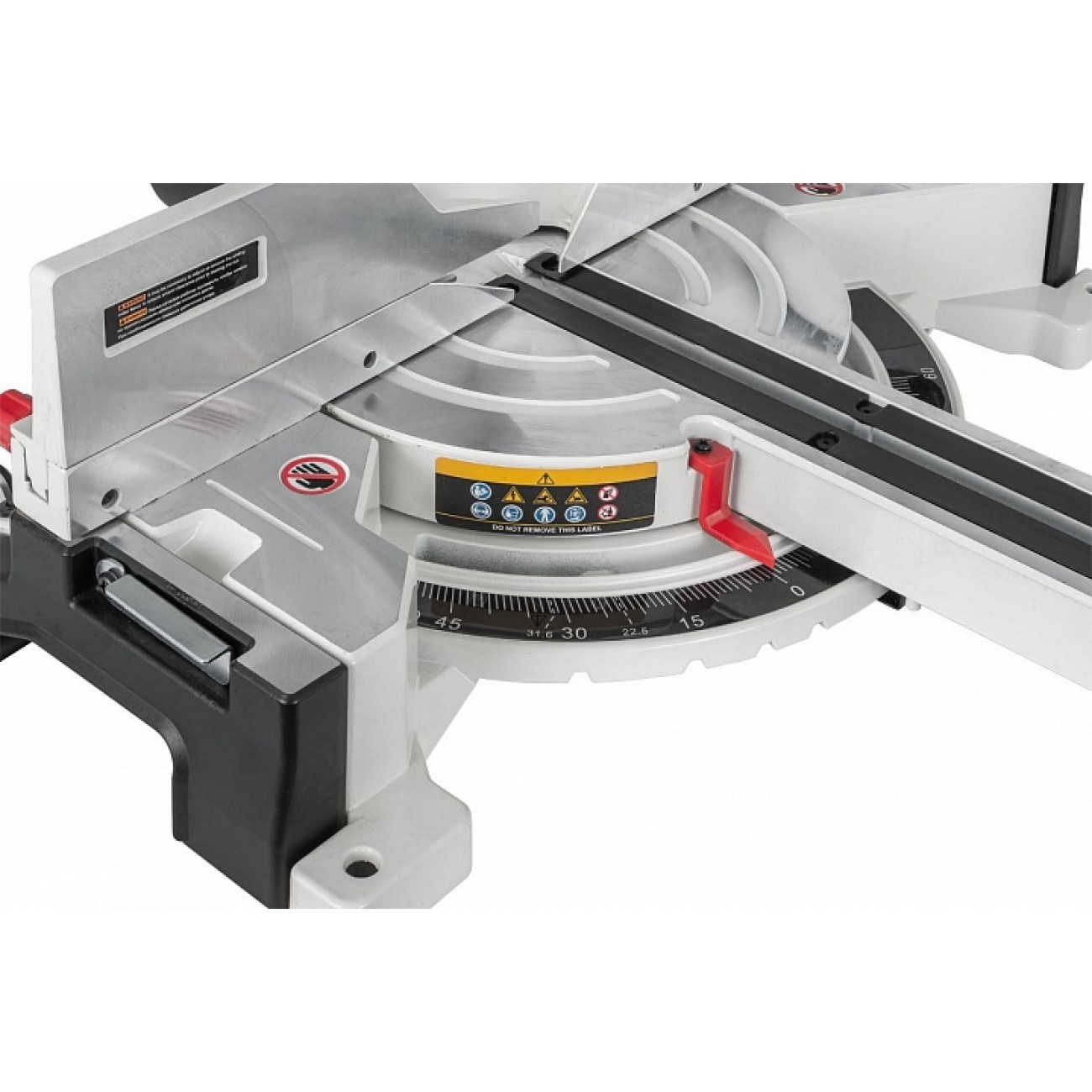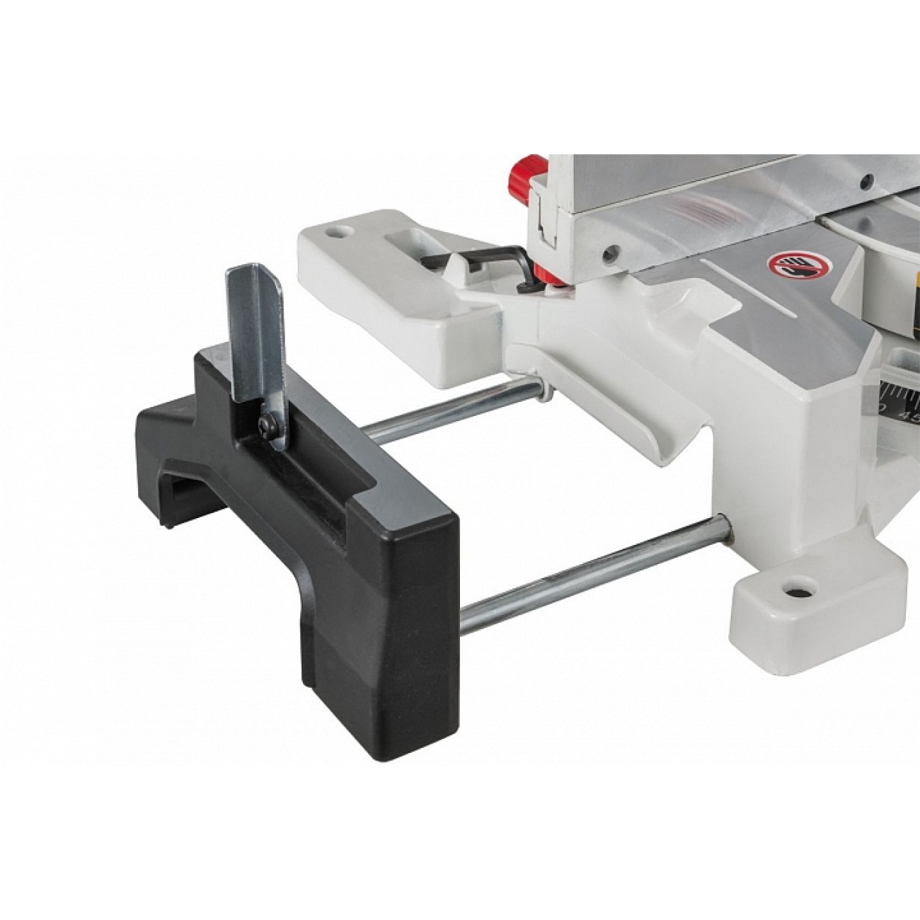 Довга, виступаюча вперед частина робочого столу з рукояткою повороту обладнана додатковою регульованою опорою для надання верстату стійкості. Стаціонарна частина столу має отвори кріплення до верстата та висувні розширення, на кожному з яких відкидний обмежувальний упор заготовки. Ліворуч або праворуч від диска можна встановити гвинтовий притиск. Основний упор заготовки має регульовану (зсувну) верхню секцію.