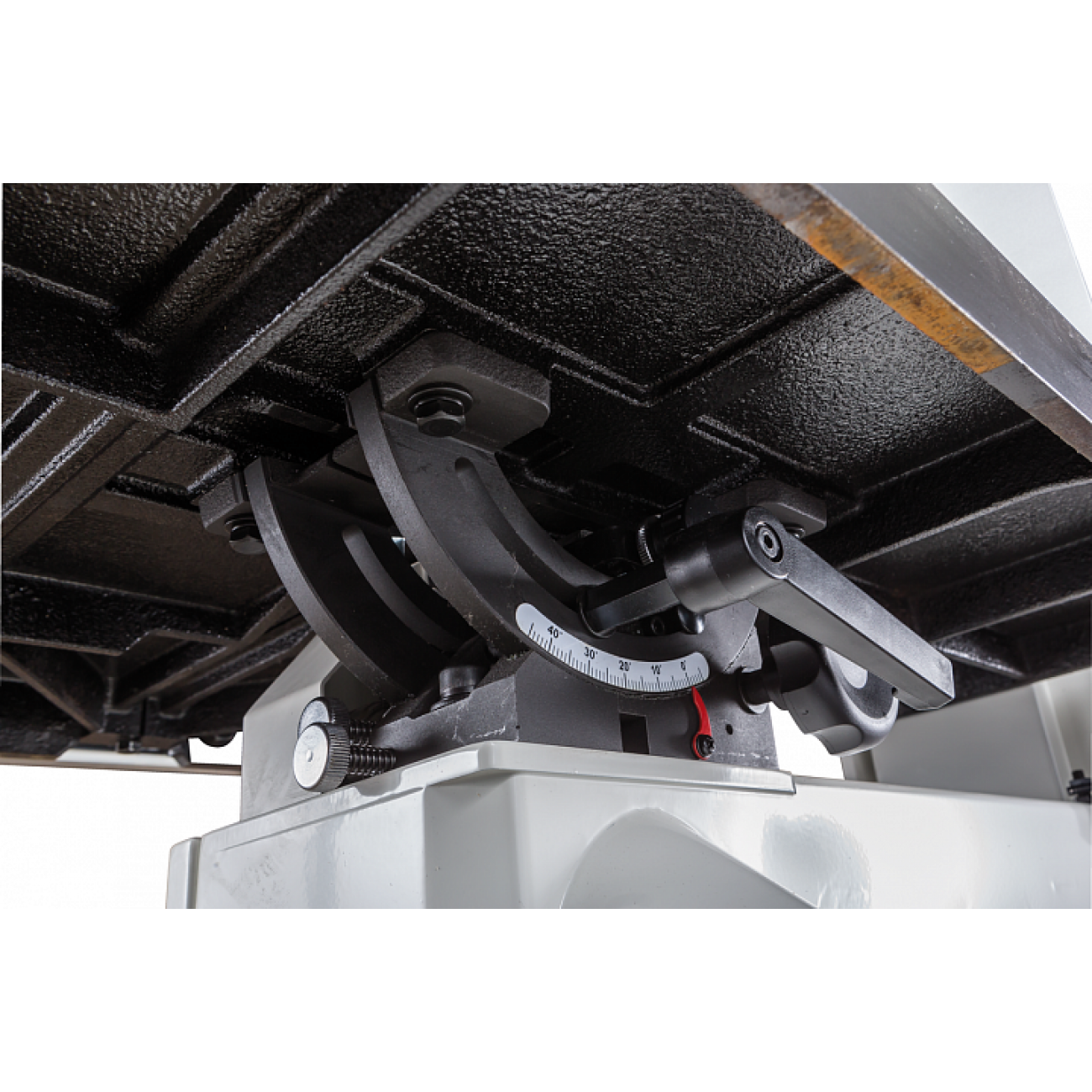 Робочий стіл чавунний, поворотні сегменти, куди він спирається, із цього матеріалу. Нахил проводиться за допомогою зубчастого механізму обертанням рукоятки та можливий в обидві сторони (на 5° у бік верстата та на 45° від нього). Для найбільшої ефективності видалення пилу встановлено два 100-міліметрових патрубки: один під робочою поверхнею, другий в нижній частині корпусу.
