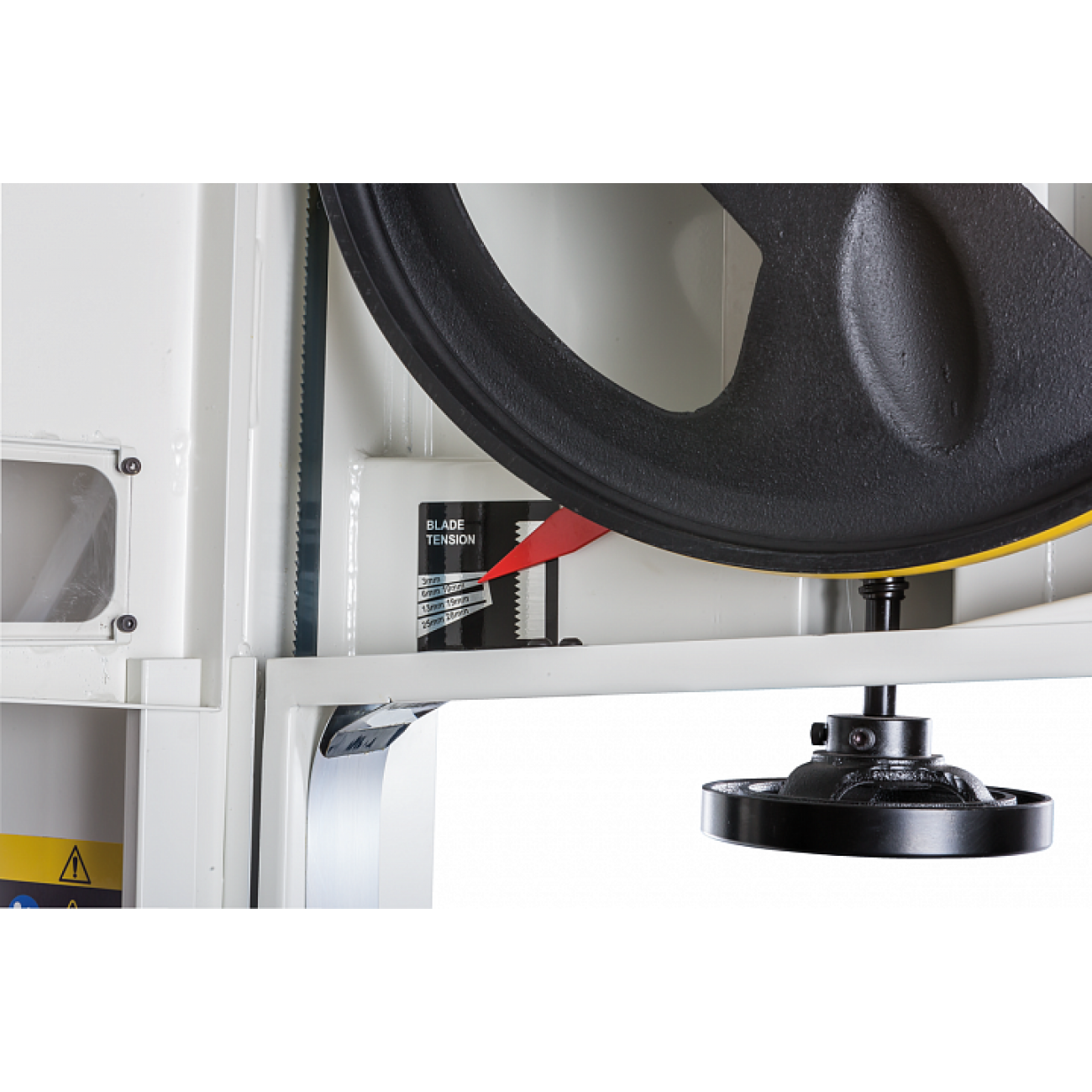 Механізм натягу та центрування стрічки включає дві групи трироликових направляючих на шарикопідшипниках, стрілочний індикатор рівня натягу, регулюючі маховики, два оглядових віконця і важіль швидкого натягу-ослаблення. Він не зовсім звичайний, оскільки має не два, а три фіксовані положення: робоче (щільно натягнуте), для зберігання (стрічка ослаблена, але тримається на шківах) та сервісне (для заміни полотна). Щоб покращити плавність роботи, використано чавунні шківи з масивним тілом, а не у вигляді спицьованих коліс, як раніше.