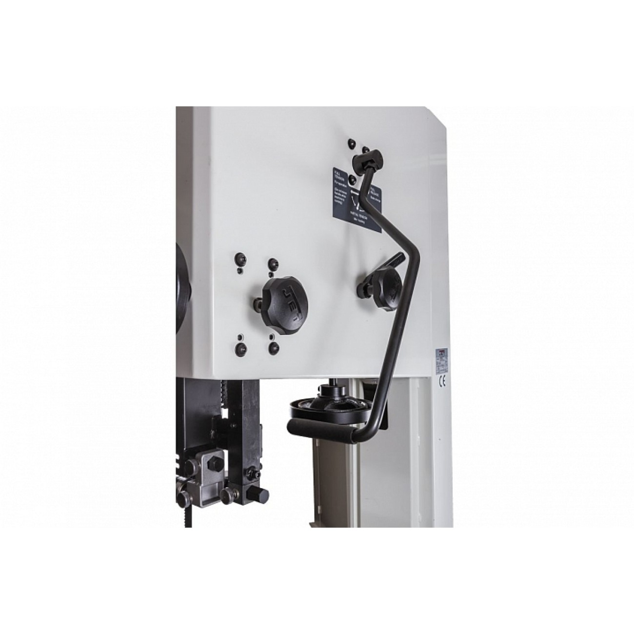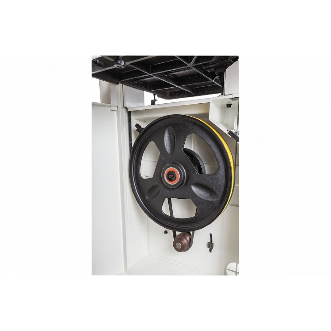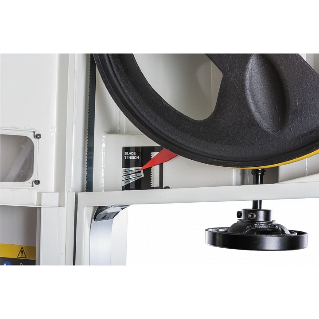 Механізм натягу та центрування стрічки включає дві групи трироликових направляючих на шарикопідшипниках, стрілочний індикатор рівня натягу, регулюючі маховики, два оглядових віконця і важіль швидкого натягу-ослаблення. Він не зовсім звичайний, оскільки має не два, а три фіксовані положення: робоче (щільно натягнуте), для зберігання (стрічка ослаблена, але тримається на шківах) та сервісне (для заміни полотна). Щоб покращити плавність роботи, використано повнотілі масивні чавунні шківи.