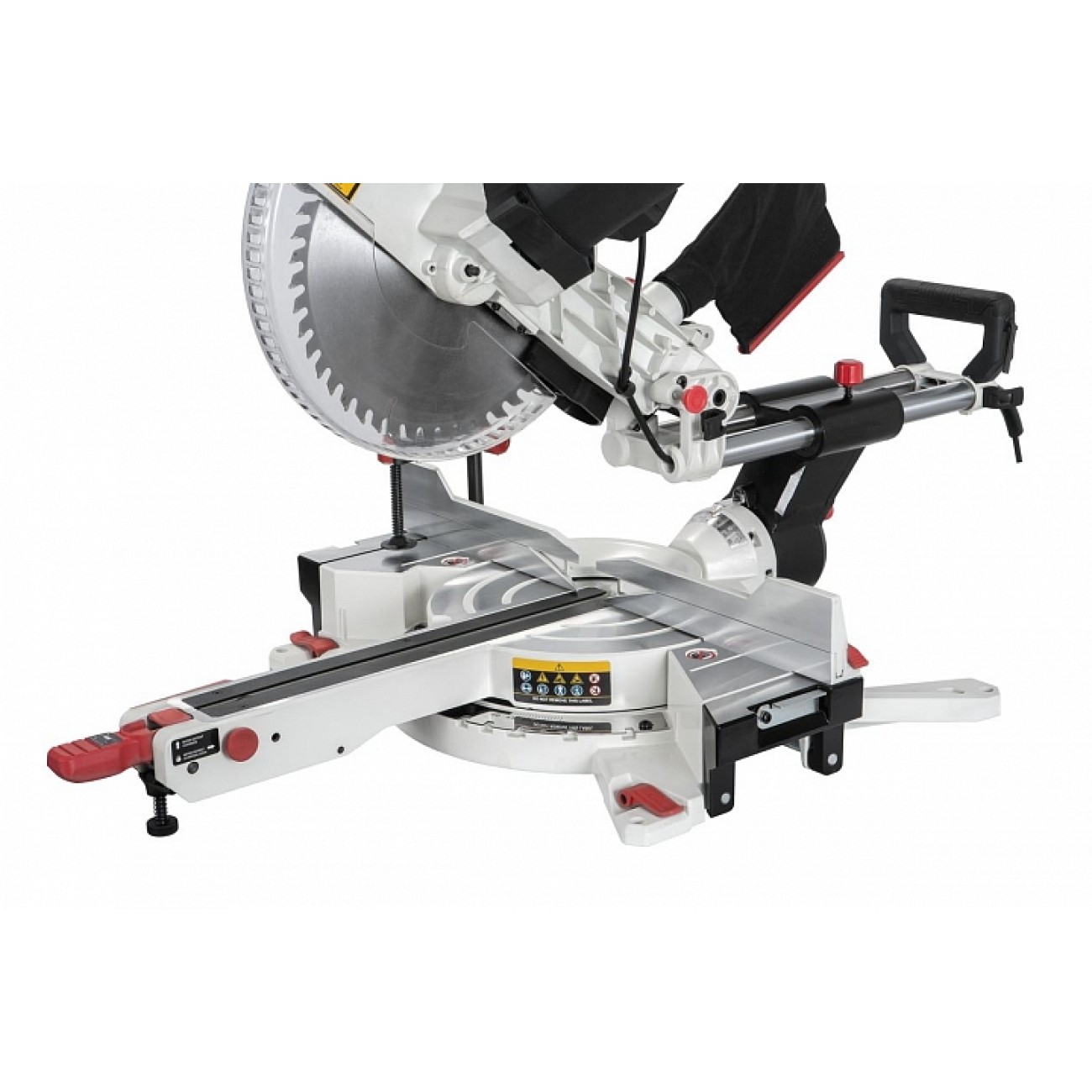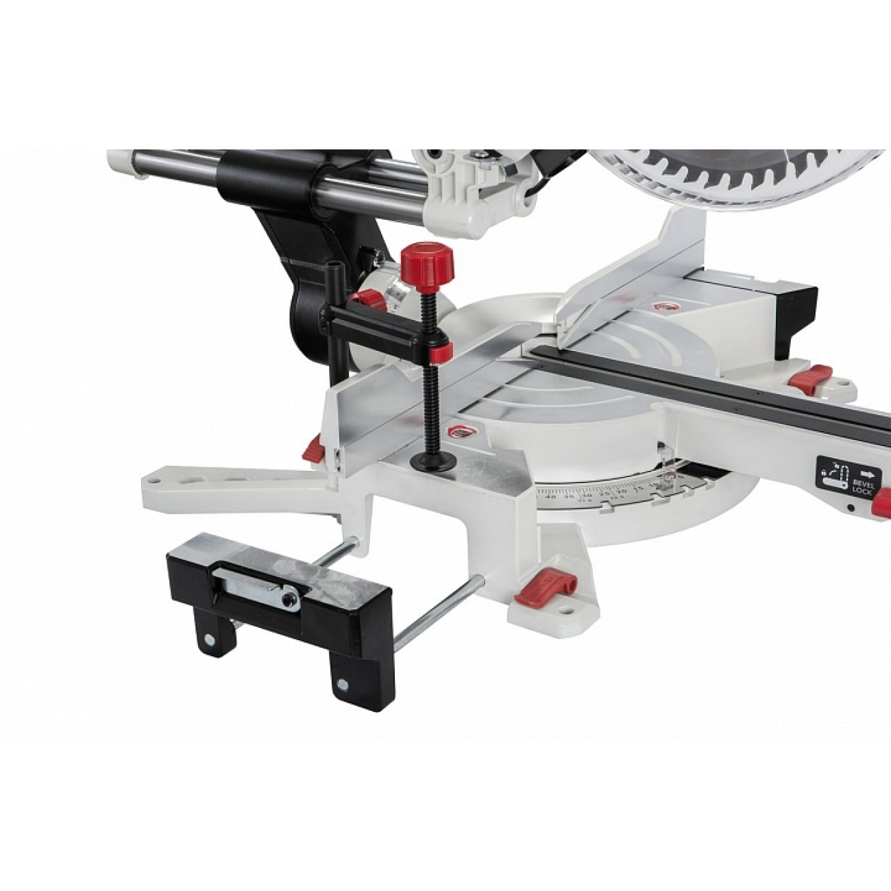 Верстат обладнаний лазерним покажчиком лінії різу, світлодіодним ліхтарем підсвічування, знімним вертикальним притиском та висувними розширювачами робочого столу з відкидними кінцевими упорами, причому стопори розширювачів із зручним ексцентриковим механізмом.