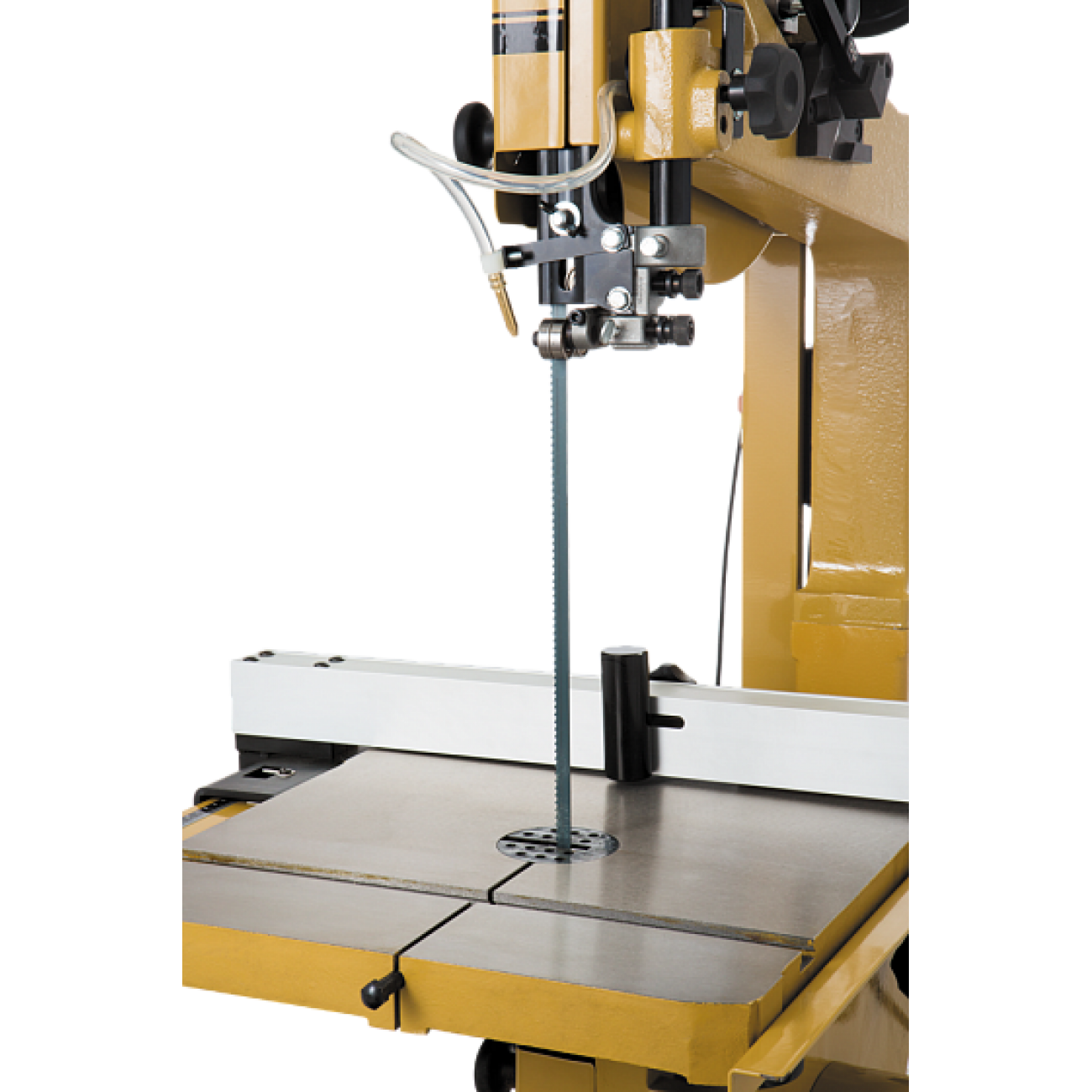 Напрямні пильної стрічки – триточкові роликові – стандартні для професійних стрічкових пилок універсального призначення. Є важіль для швидкого натягу та ослаблення полотна, що має три позиції: робочу, для зберігання (стрічка ослаблена) та сервісну для заміни полотна.