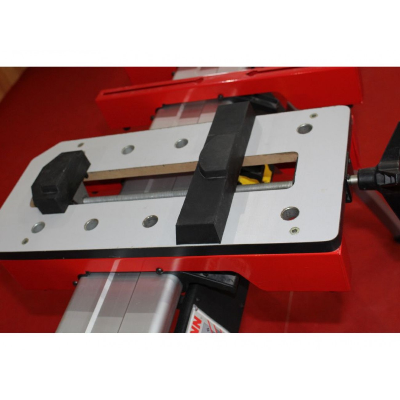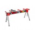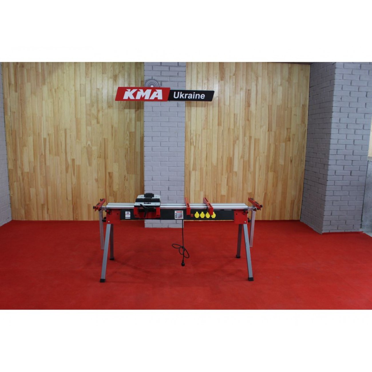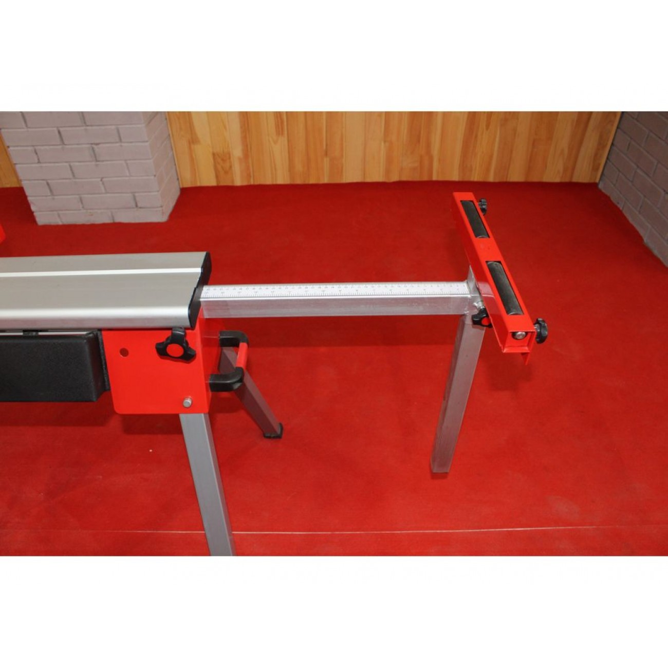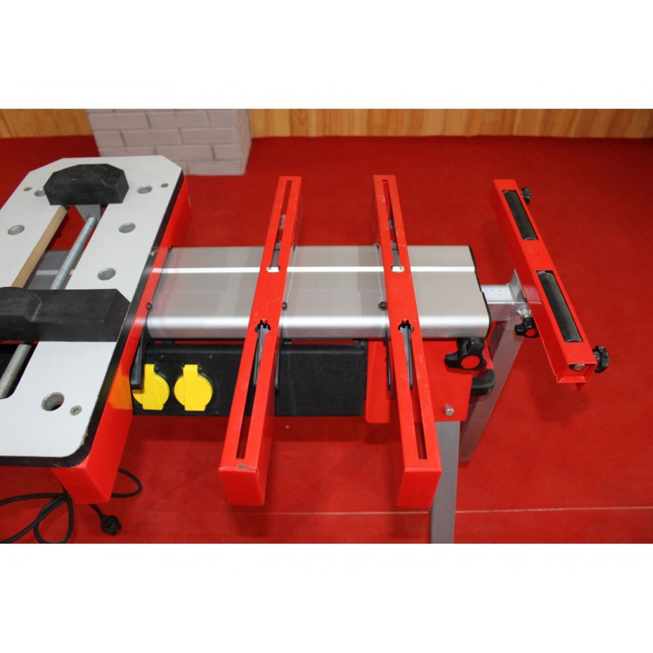 В комплект поставки входить затискний стіл, завдяки якому можна легко зафіксувати заготовки різного розміру і типу. Висувні роликові стійки зі шкалою забезпечують підтримку довгих матеріалів для їх якісної обробки. Конструкція виготовлена з якісного металу з антикорозійним покриттям і може складатися, тому ця підставка для інструменту надійна, довговічна і зручна у використанні та зберіганні.