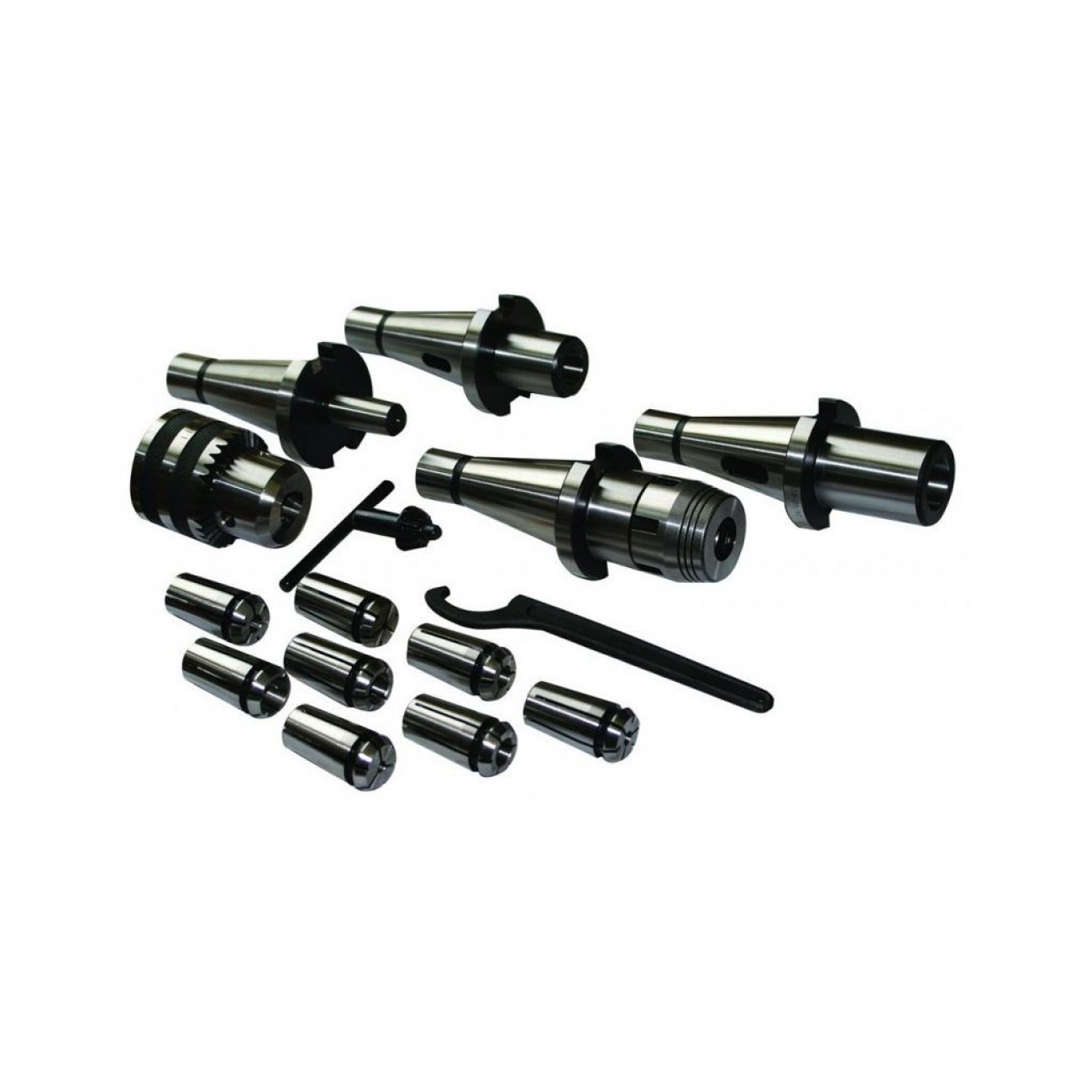 Комплект поставки: Механізм подачі по осі X, вузол охолодження, комплект цангових патронів 8 шт. (4,5,6,8,10,14,12,16 мм), свердлильний патрон 1-16 мм (B18), 1 шт.,перехідні втулки MK2/B18, MK3/B18, верстатні лещата 160 мм.