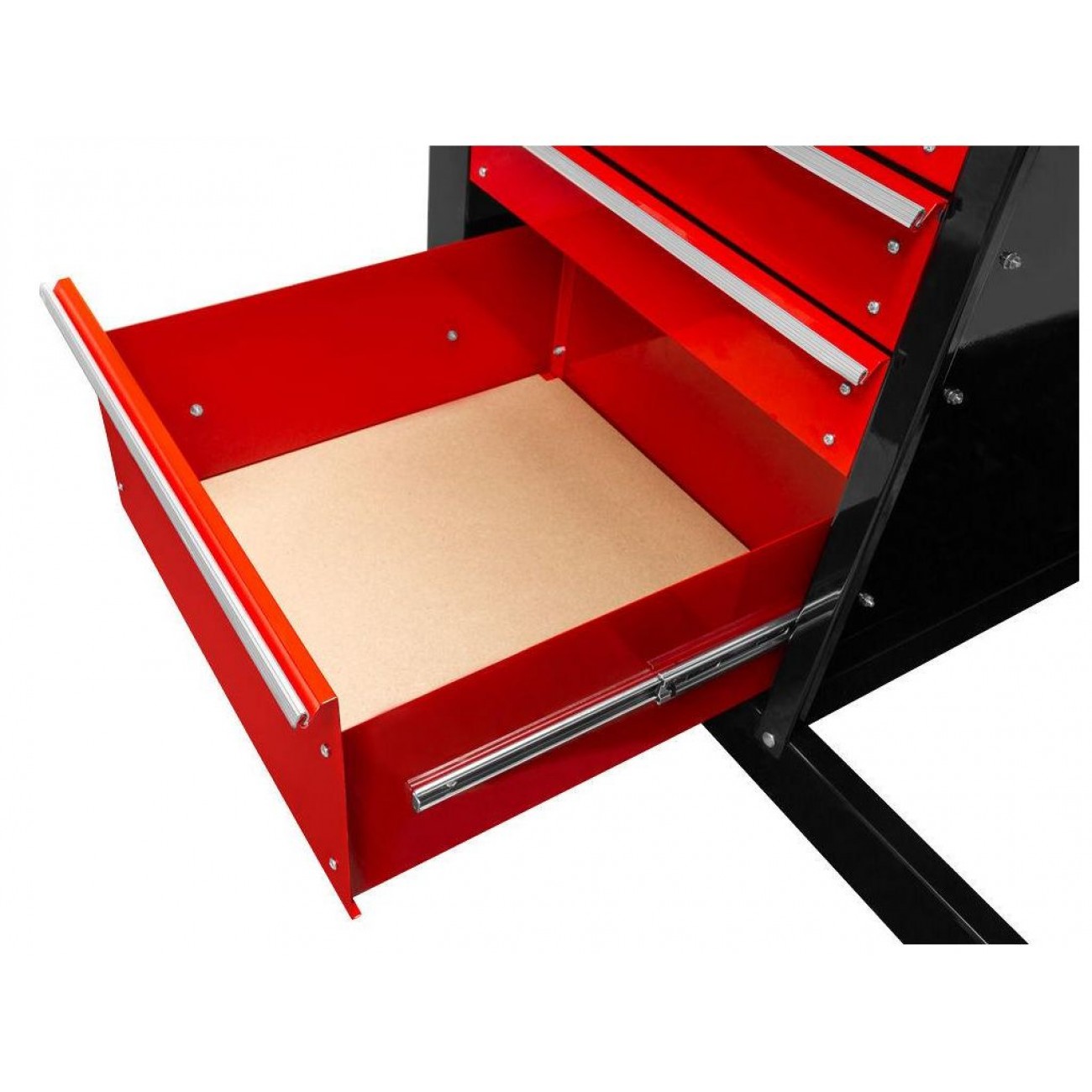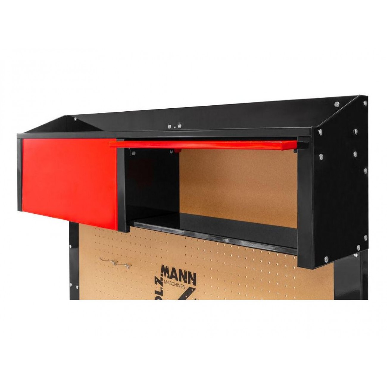 2 великі ящики над стільницею і 4 місткі шухляди на кулькових підшипниках з лівого боку під стільницею забезпечують зручне зберігання інструменту та аксесуарів. Перфорована задня стінка дозволяє розташувати до 20 гачків для закріплення необхідного для роботи устаткування. Цей та інші верстаки столи для майстерень високої якості можна замовити на KMA.UA.