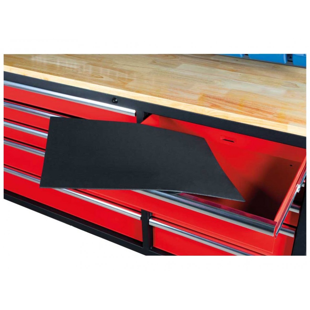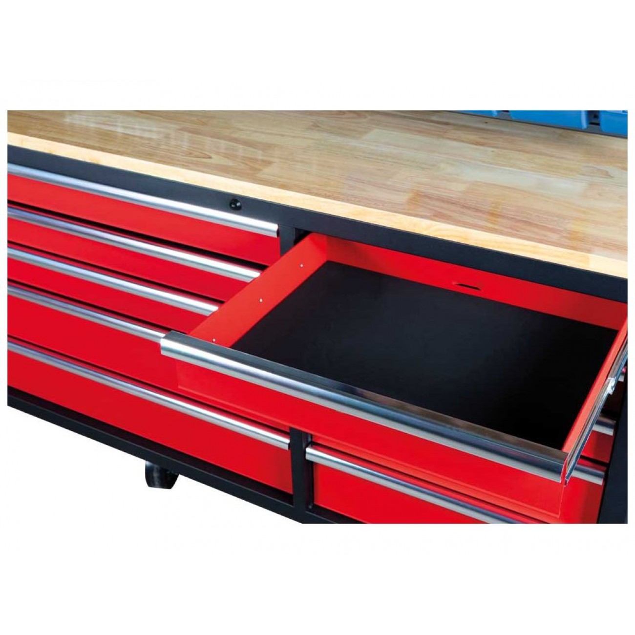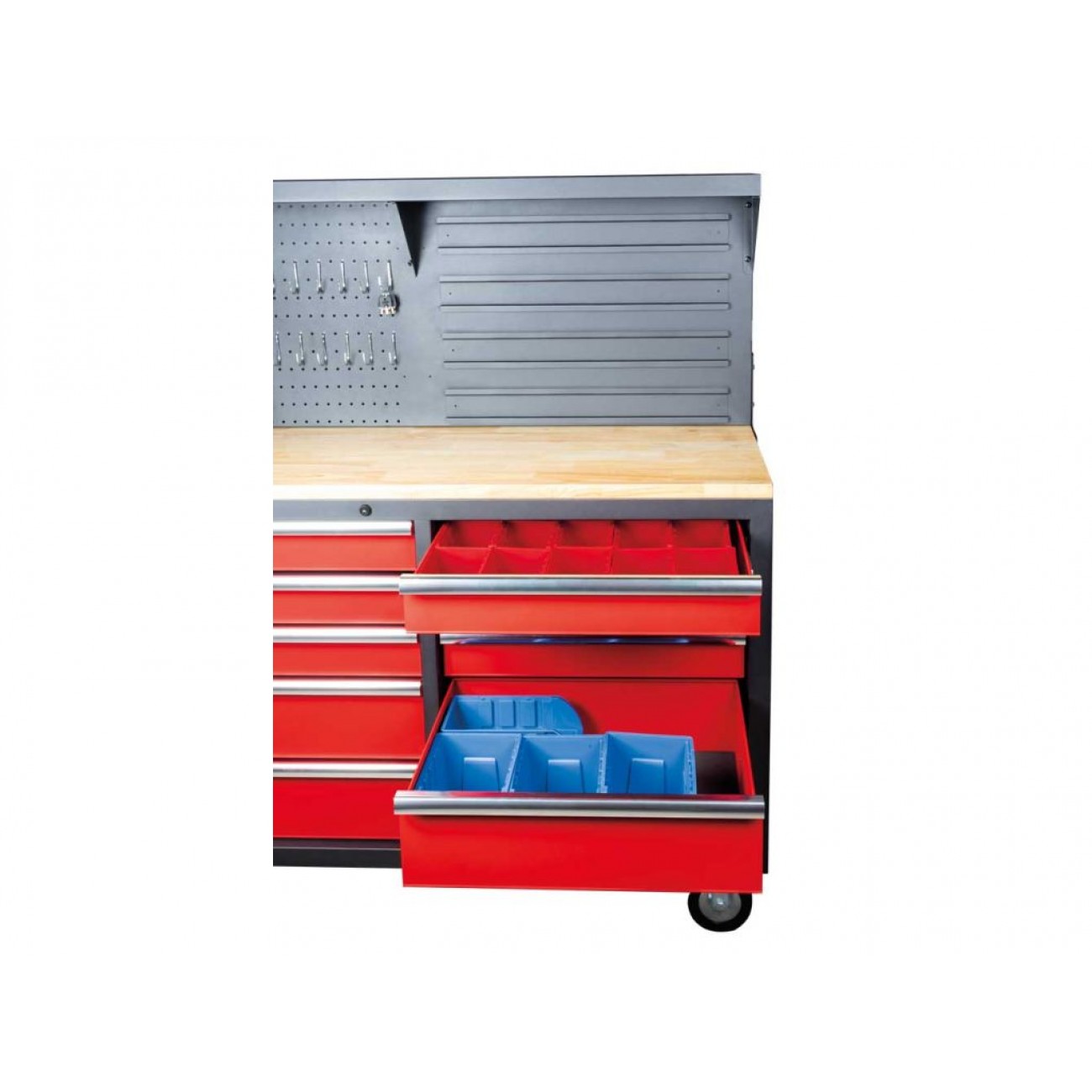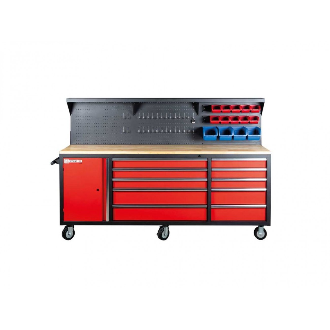 6 коліщат (4 поворотних і 2 фіксованих) зі стоянковим гальмом дозволяють переміщати верстак по робочій зоні і надійно його встановити у потрібному місці. Є зручна ручка для управління переміщенням. Перфорована стінка і стільниця мають можливість повороту, що збільшує спектр можливих застосувань. Цей верстак на колесах пересувний стане вдалим доповненням майстерні будь-якого профілю.
