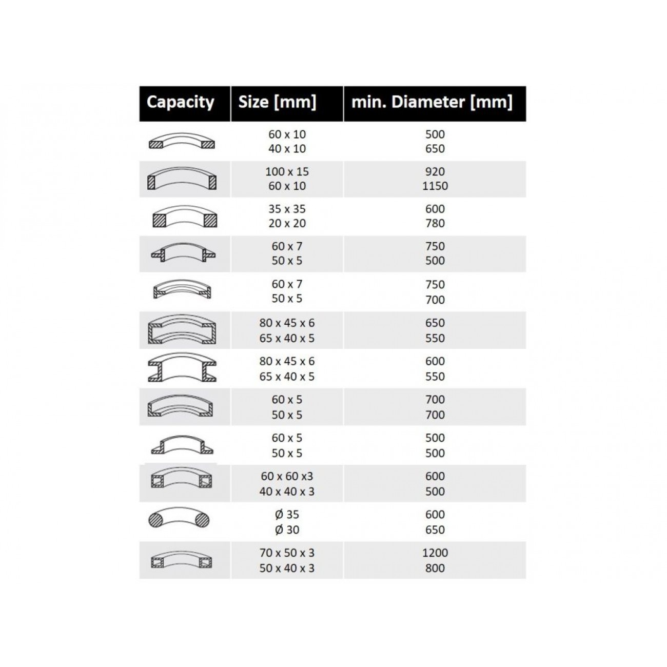 Верстат для гнуття Holzmann RBM 50 призначений для згинання металевих профілів і труб. Оснащений двома роликами з міцної, загартованої сталі, які запускаються через редуктор. Також в комплектації є набір універсальних роликів, що дає змогу згинати різні форми. Радіус вигину можна регулювати за допомогою важеля та ноніунсної шкали у верхній частині верстата. Ролики регулюються по ширині. Обертання вліво-вправо зі швидкістю 9,3 об/хв. Діаметр валу - 50 мм, діаметр роликів - 160 мм.