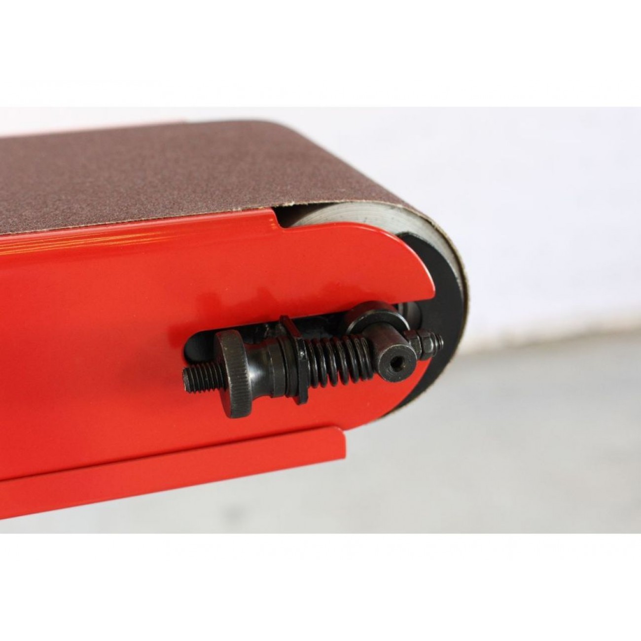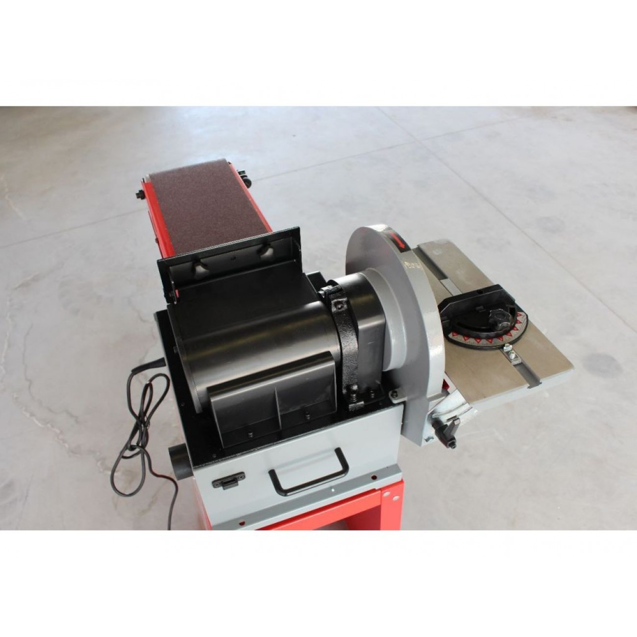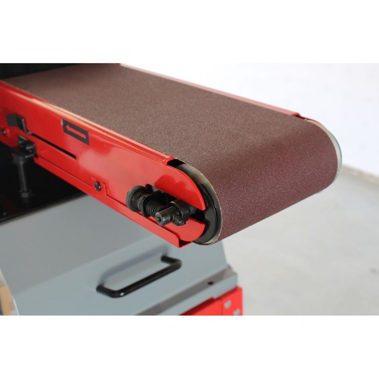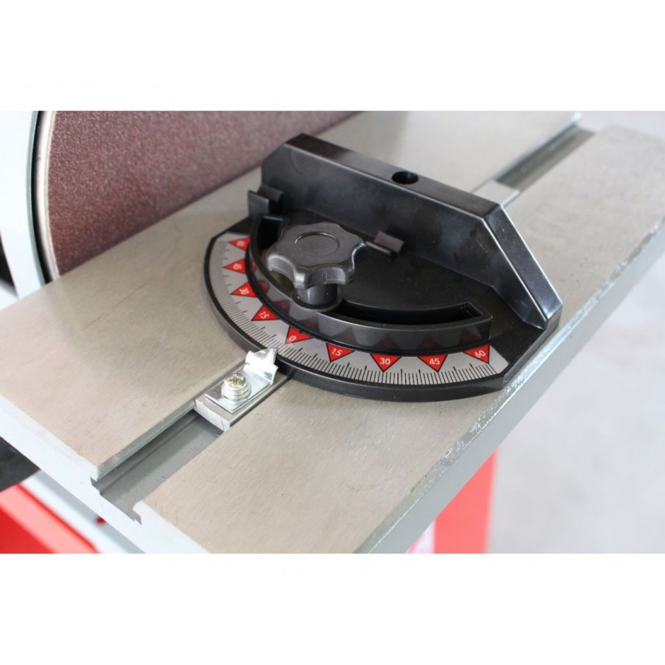 Вузол шліфувальної стрічки має кут нахилу від 0 до 90° в горизонтальному і вертикальному напрямках. Стрічка має плавний хід з постійною швидкістю 8 м/с. Тарілчастий шліфувальний диск має швидкість обертання 2980 об/хв. Алюмінієвий стіл повертається на 45 градусів. Станина з сірого чавуну стійка та мінімізує вібрації, що дає змогу досягти високої точності обробки. Верстат можна встановити на опорну раму, яка входить у стандартну комплектацію, або будь-яку тверду поверхню. Замовити цей та інші шліфувальні верстати для дерева з гарантією і доставкою по Україні можна у нашому інтернет-магазині.