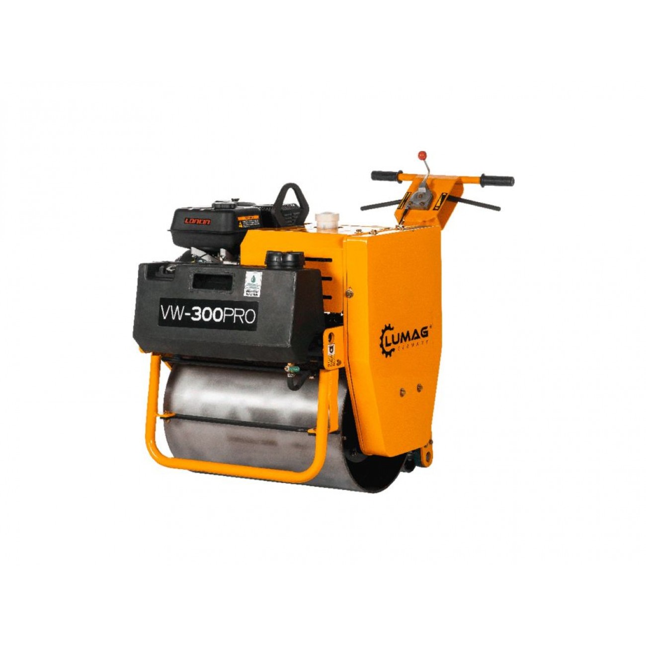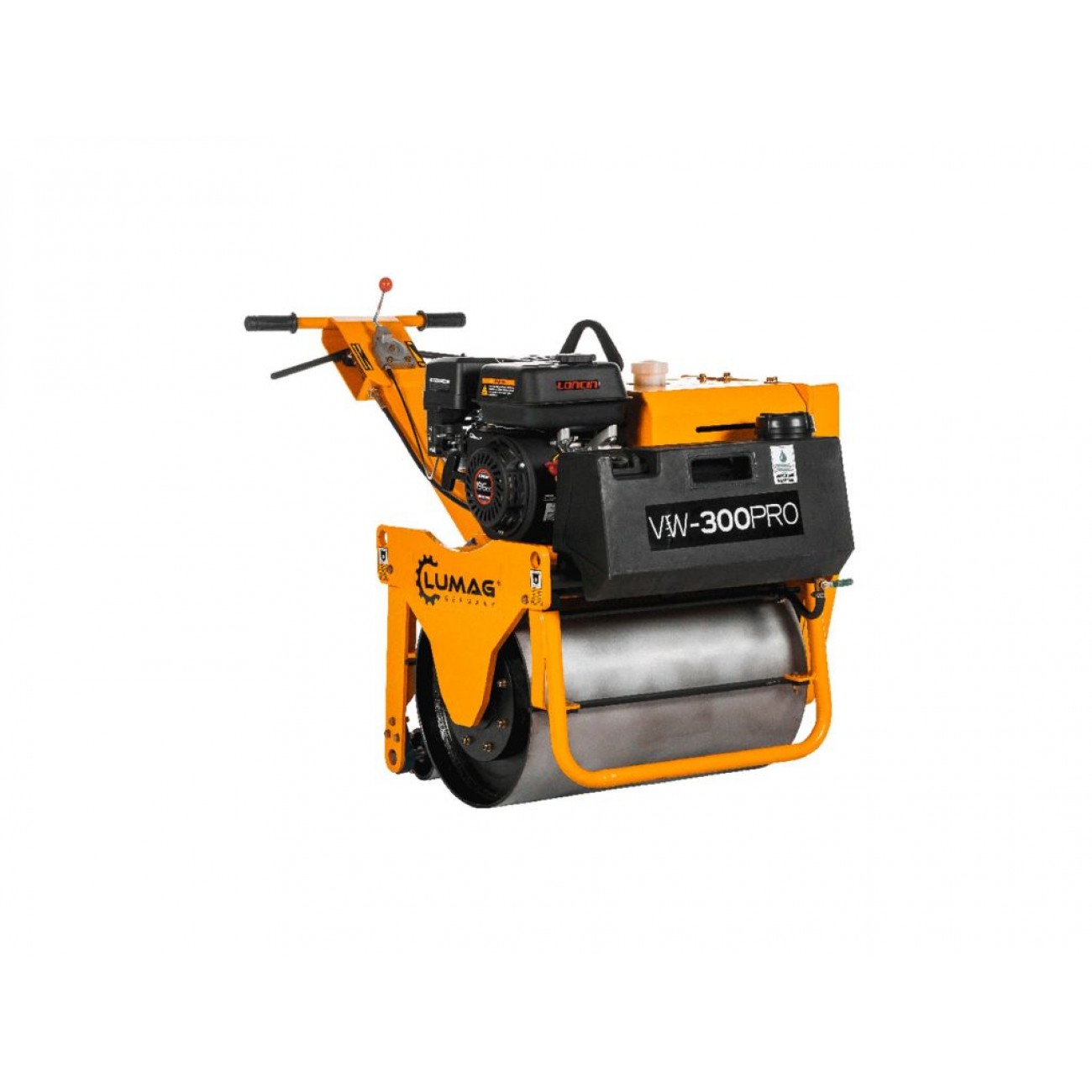 Lumag VW300PRO — віброкаток середньої важкості для використання в будівництві доріжок, садівництві та ландшафтному дизайні, укладанні тротуарів або невеликих ремонтних роботах у будівництві доріг. Безступінчастий гідростатичний привід забезпечує швидкість до 2,1 км/год вперед і 1,4 км/год назад. Віброплита має невеликий бічний звис для оптимального ущільнення аж до стін або бордюрів. Крім того, є передні та задні склоочисники, а також міцна захисна рама з центральною одноточковою підвіскою та опорами безпеки спереду та ззаду. Направляюче дишло можна розташувати вертикально для транспортування, а резервуар для води вгорі забезпечує постійне розпилення води під час роботи на чорній палубі.