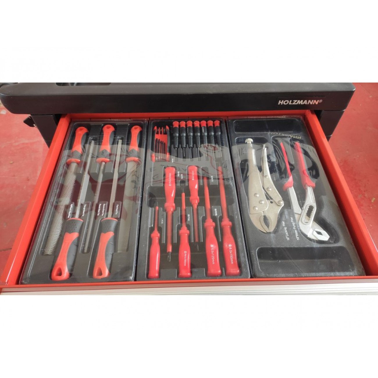 Інструменти виготовлені з хромованадієвої сталі, яка має високу міцність і стійкість до зносу. Всі предмети зручно розсортовані у 7 великих ящиках на шарикопідшипниках, розмір яких збільшується зверху донизу. Корпус візка має посилену конструкцію зі сталі з антикорозійним покриттям, що забезпечує його надійність і тривалий термін служби. Колеса і зручна ручка дозволяють легко транспортувати візок по майстерні, а за допомогою системи блокування можна встановити його у зручному місці. Візок інструментальний з інструментом Holzmann WW 790W в наявності в інтернет-магазині офіційного постачальника виробника в Україні KMA.UA.