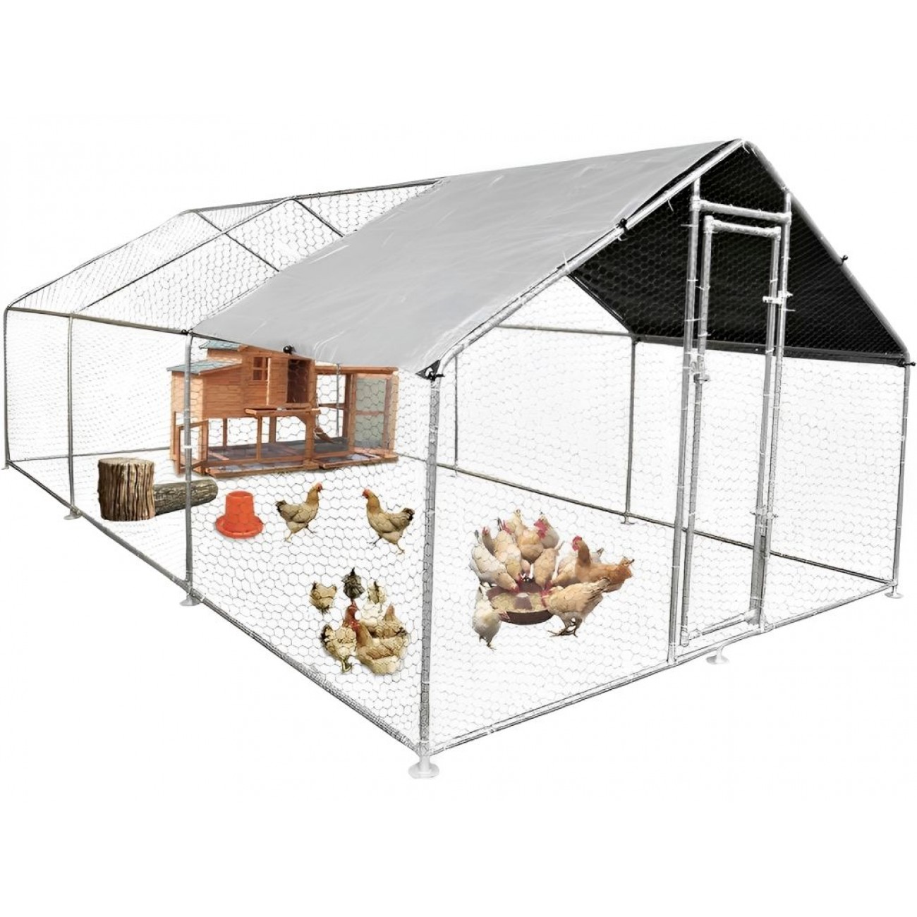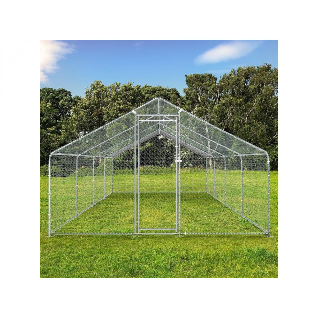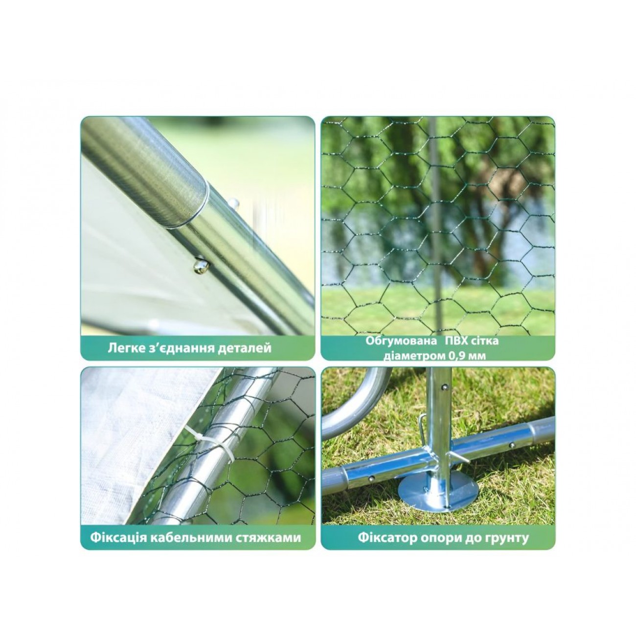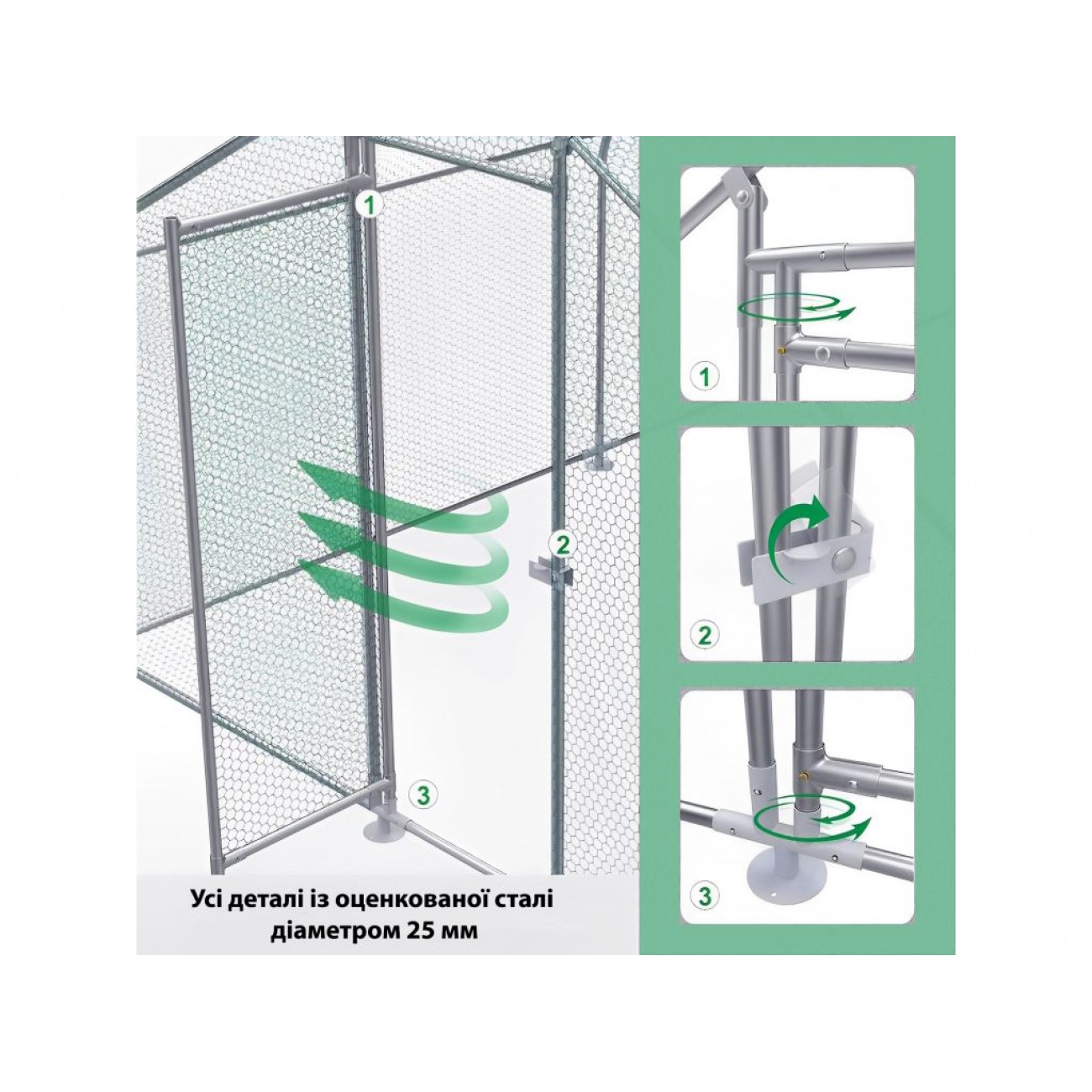 Каркас виготовлений з оцинкованої сталевої труби Ø25 мм, для покращення стійкості є фіксатори опор для грунту. Оцинкована сталева сітка з ПВХ покриттям і розміром отворів 0,9 мм надійно захищає птахів від хижаків і запобігає їх втечі. Половина накриття виконана з сітки, інша половина - з водонепроникного, стійкого до УФ променів матеріалу для захисту птиці від опадів і палючого сонця. Завдяки універсальності і надійності конструкції, можна використовувати цей вольєр для качок, курей, гусей та іншої домашньої птиці.