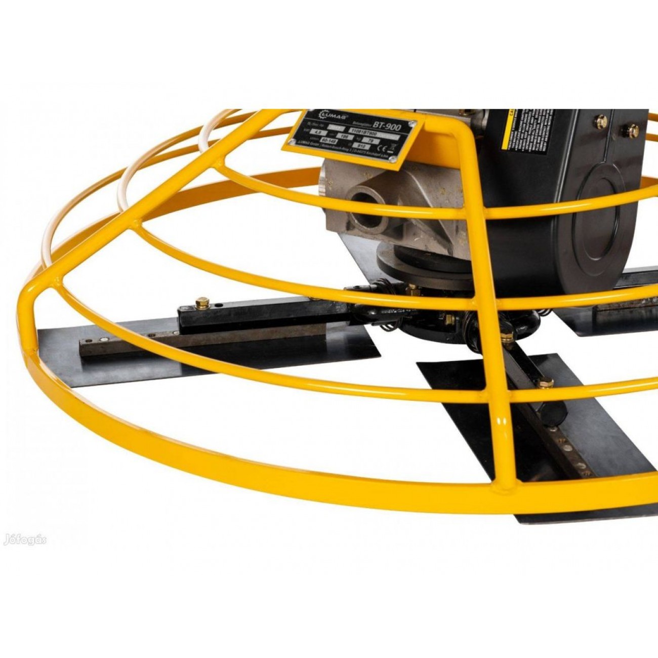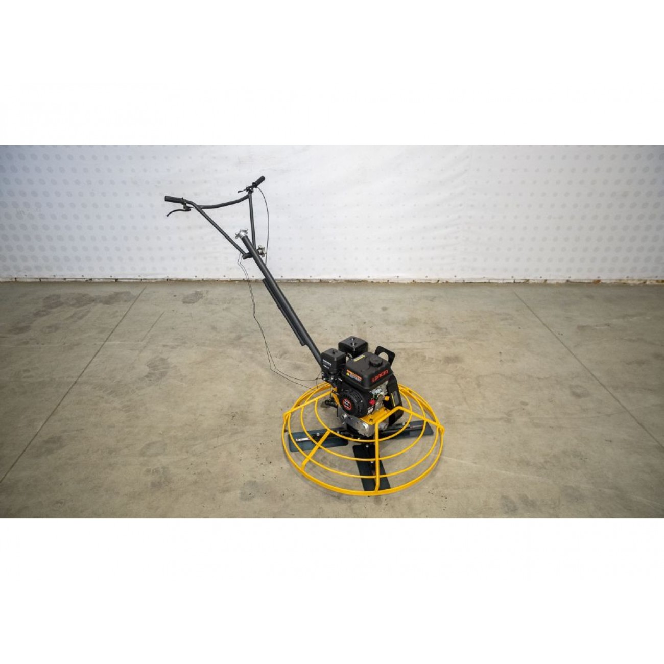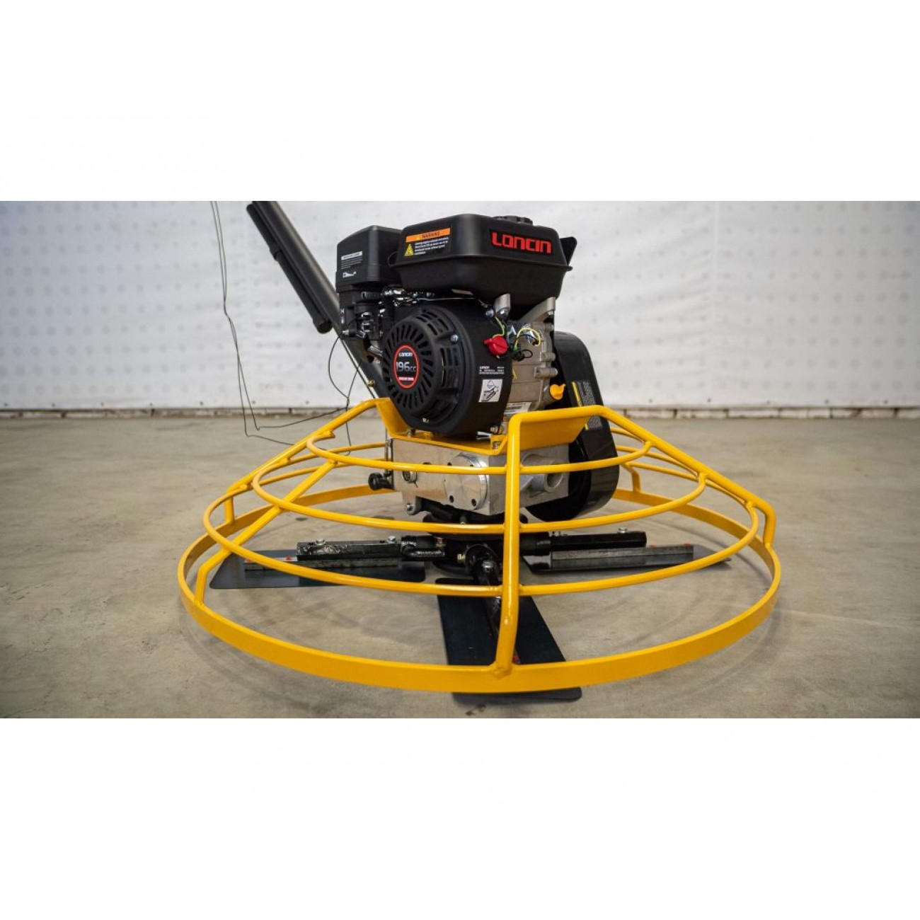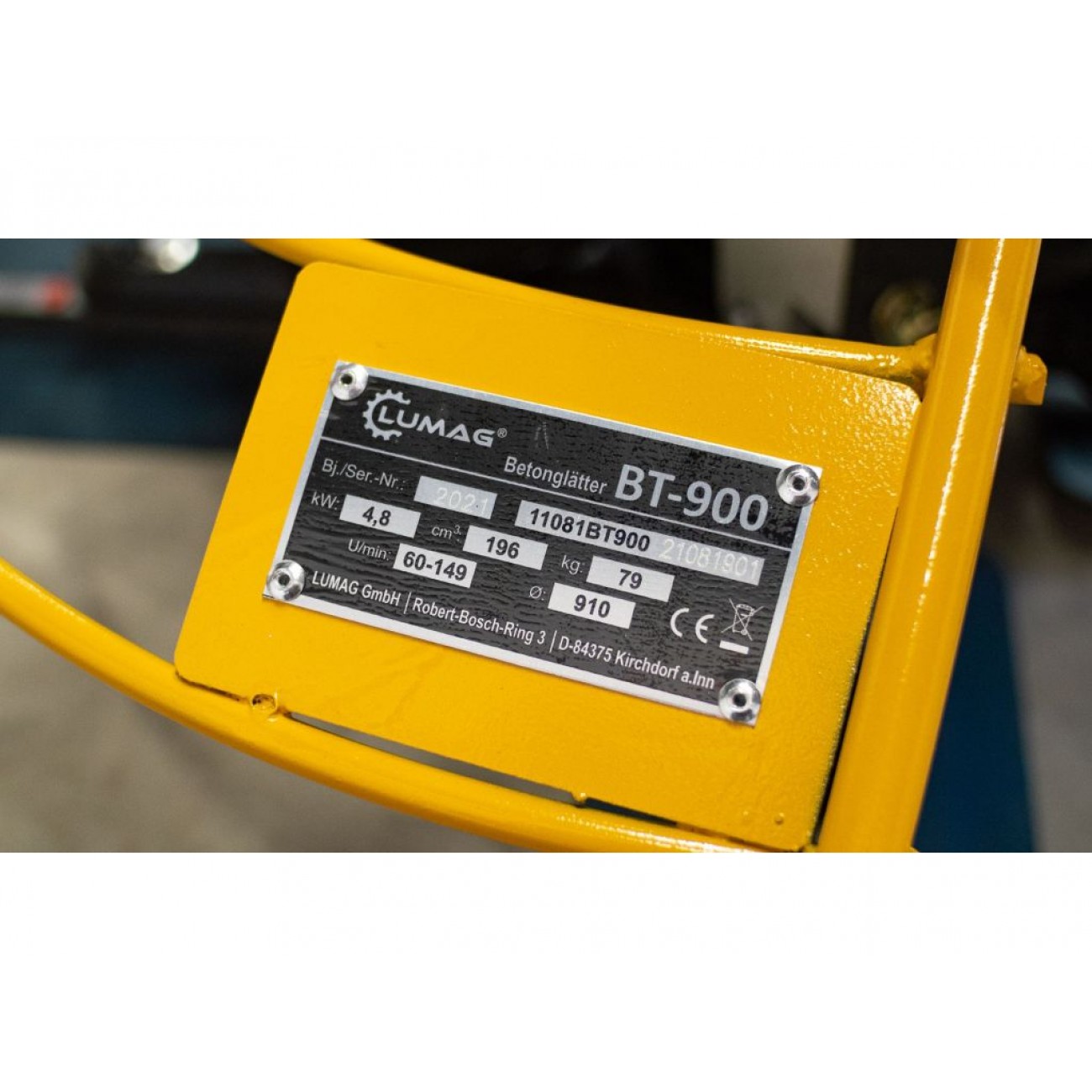 Затиральна машина по бетону Lumag BT900 з діаметром ротора 910 мм і витривалим 4-тактним бензиновим двигуном LONCIN G200F потужністю 4,8 кВт забезпечує швидке та ефективне згладжування і вирівнювання бетонних поверхонь, промислових підлог, композитних стяжок та асфальту. Оснащена 4 лопатями розміром 350х150 мм, які мають регульовану швидкість обертання у діапазоні 60-140 об/хв та кут нахилу 0-15°. Це дозволяє якісно опрацьовувати різні типи поверхонь, кути та ділянки вздовж стін. Для захисту лопатей від ударів об перешкоди є запобіжне кільце. Запуск за допомогою ручного стартера.