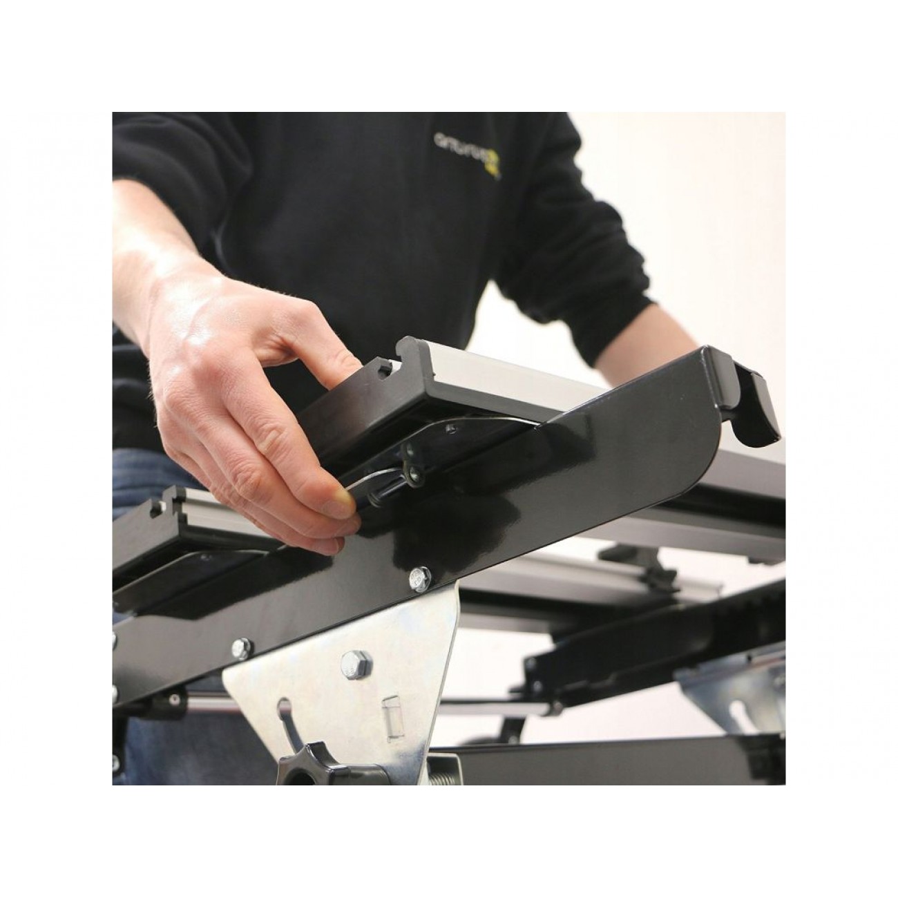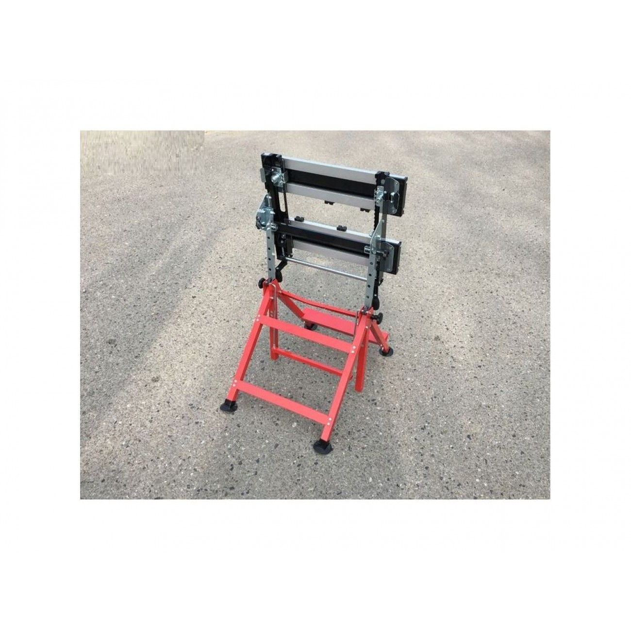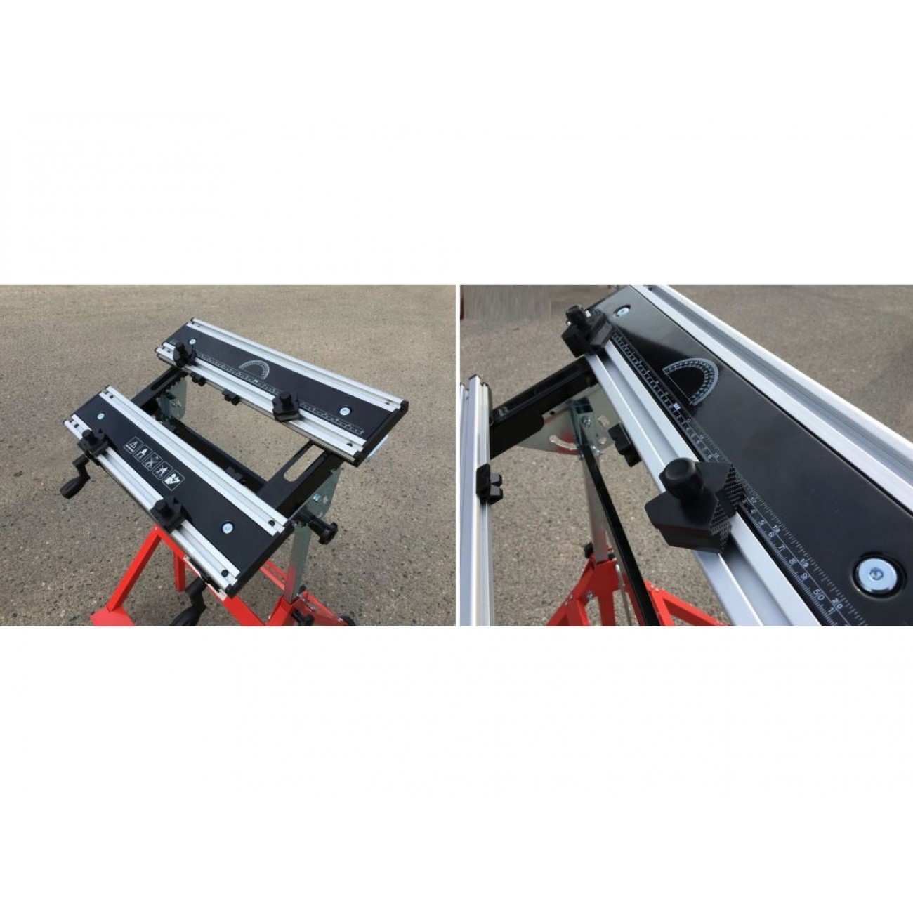 Стіл виготовлений зі зносостійкого алюмінію, опорна рама - зі сталевих труб прямокутного перерізу. Ніжки мають додаткові опори, що покращує стійкість і стабільність робочої поверхні. Невеликий розмір і вага всього 14 кг дають змогу без зусиль транспортувати пристрій і легко встановити його на об’єкті. Для компактного зберігання цей стіл верстак можна скласти.